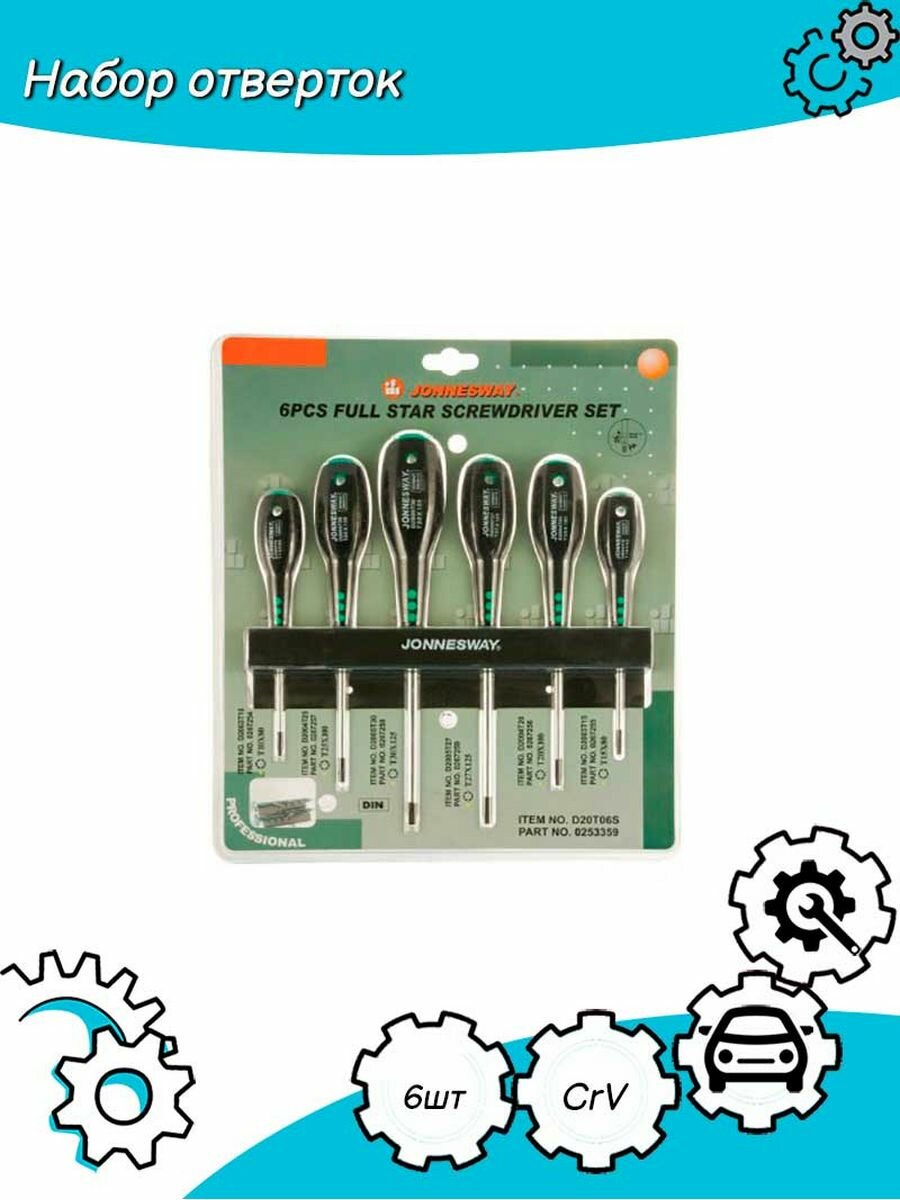 | Дополнительная информация | Набор отверток стержневых TORX® FULL STAR, 6 предметов Jonnesway |