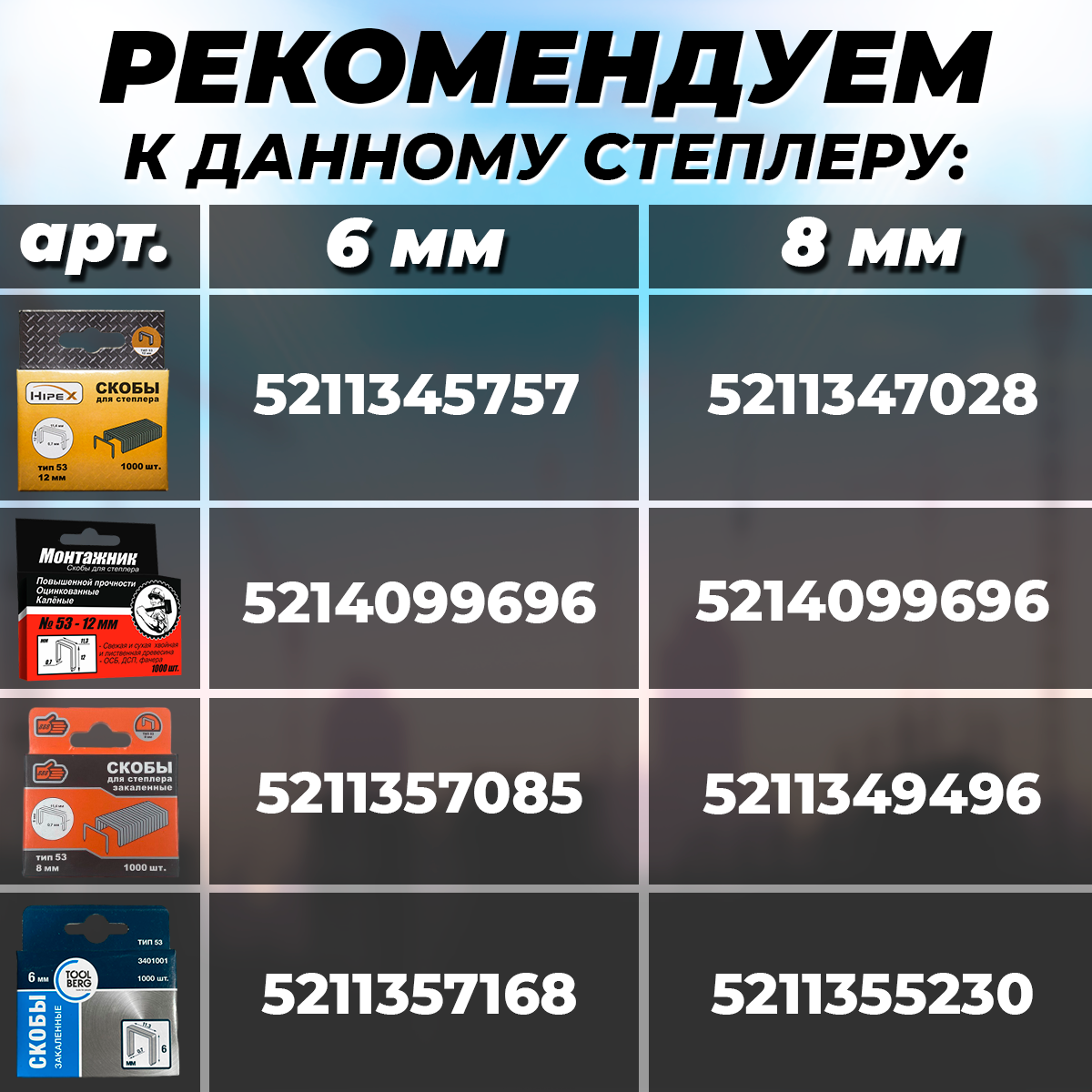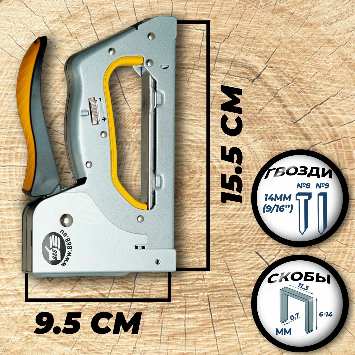 Степлер строительный / мебельный , скобы: 6-14 мм (ТИП 53), гвозди: 14мм (ТИП 300), рессорный, металлический корпус и регулятор силы удара, 888 интересное: