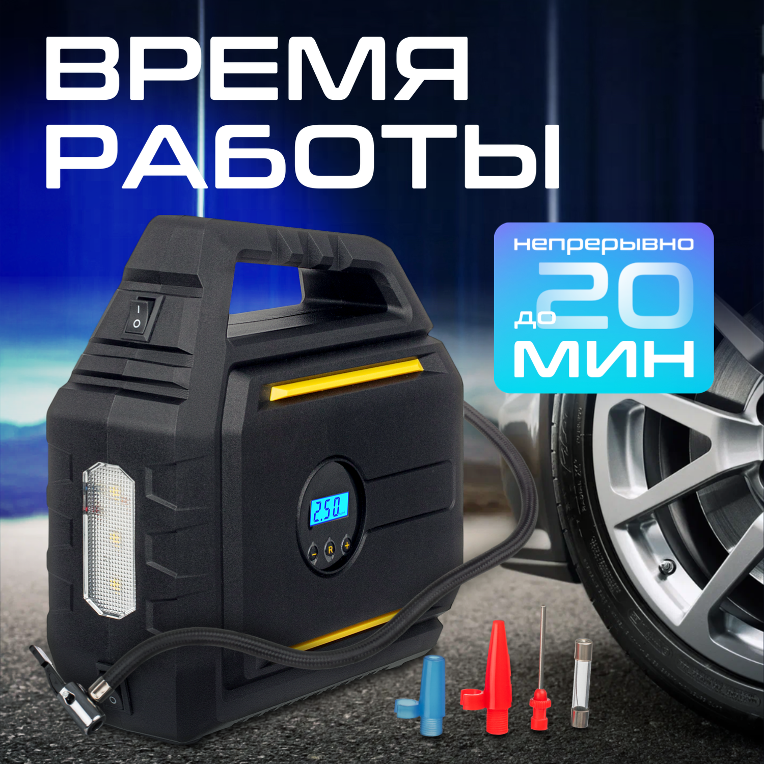 | Подробная комплектация | Компрессор, насадки, провод с штекером на прикуриватель, шланг, инструкция |