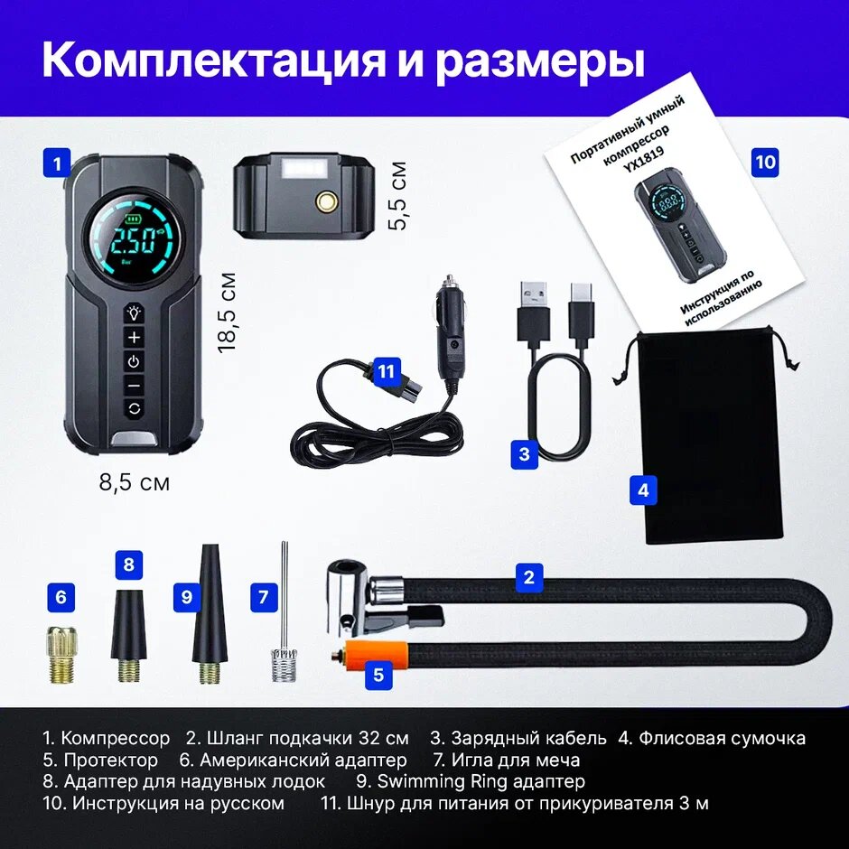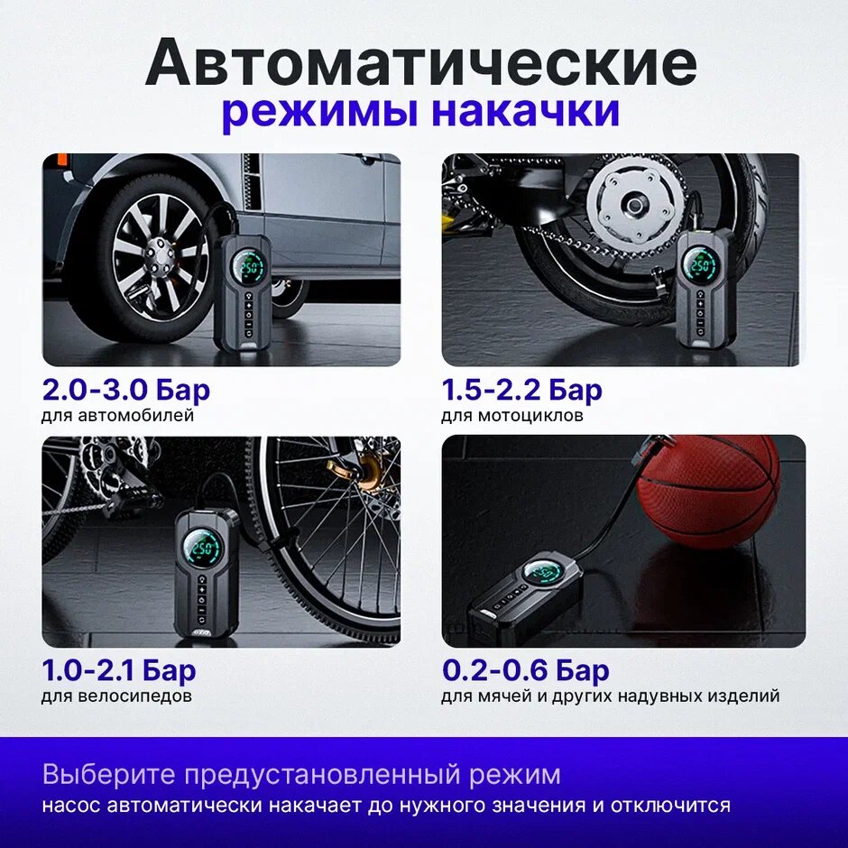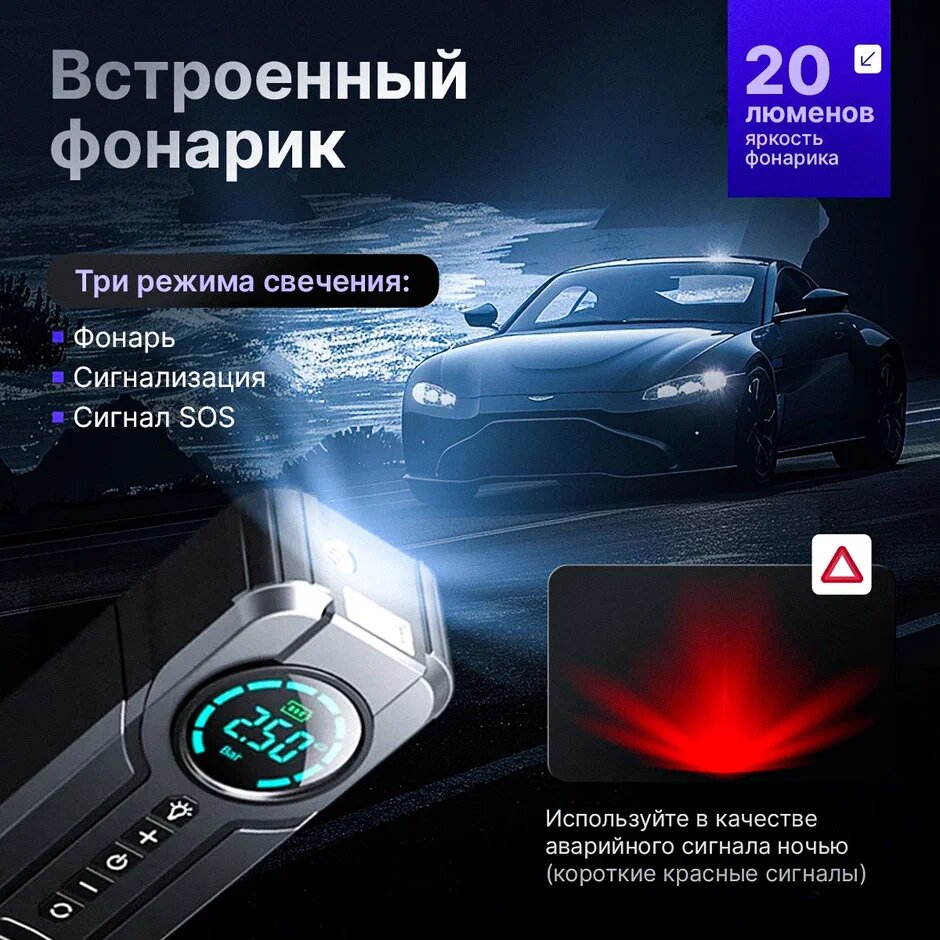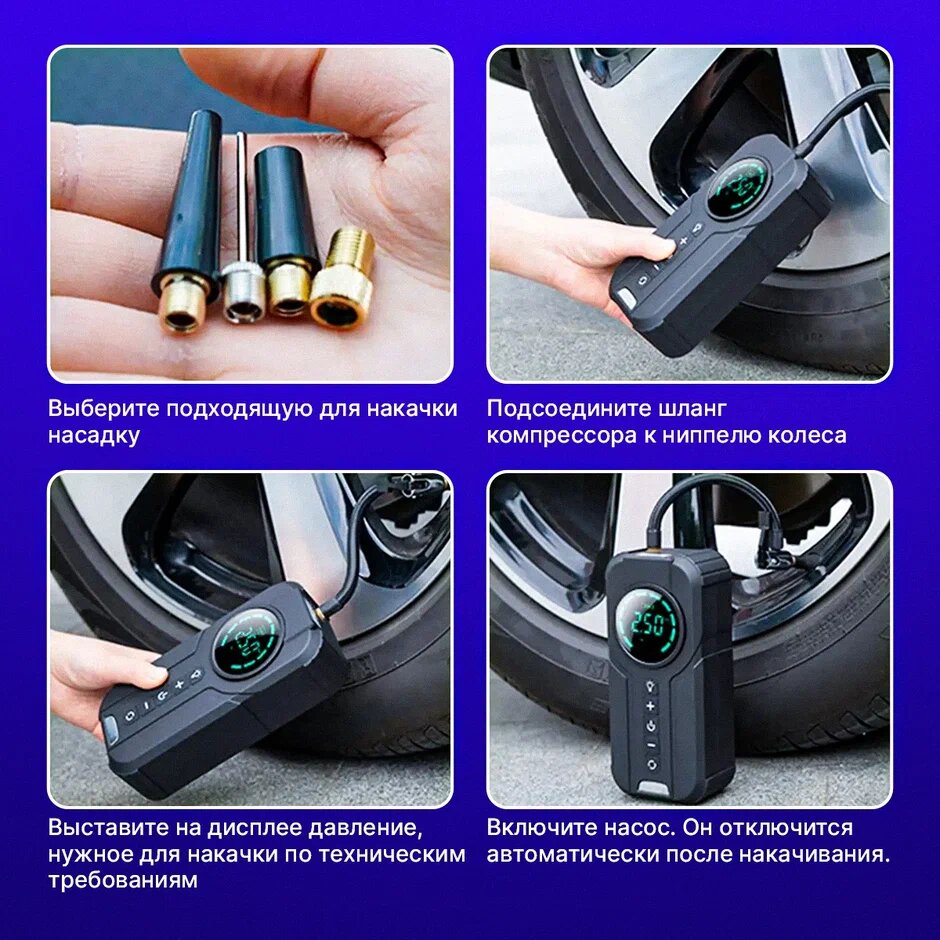 Компрессор автомобильный аккумуляторный 8400мАч, 38л/мин, powerbank, 4 насадки: для авто, для мото, для велосипеда, для мячей интересное:
