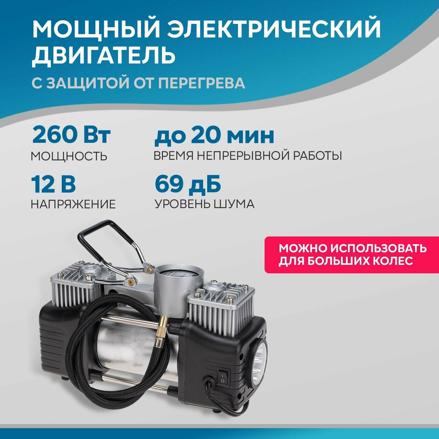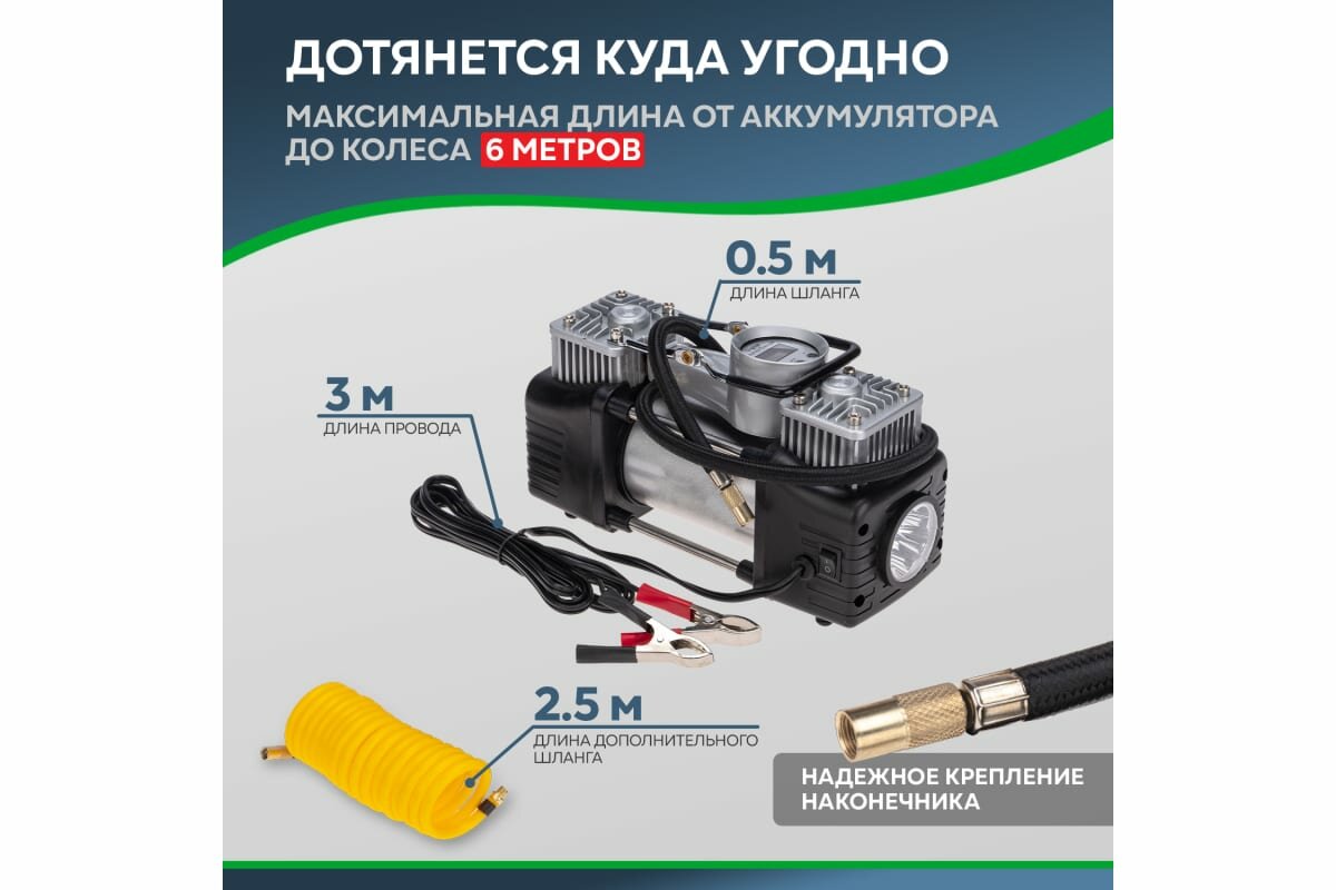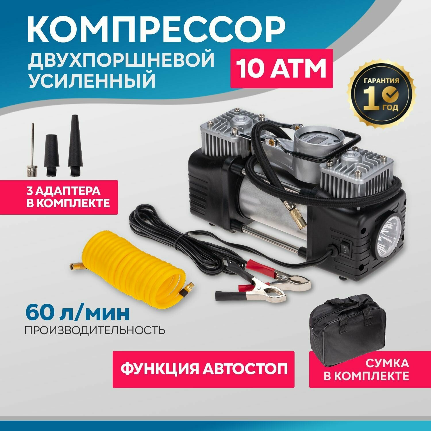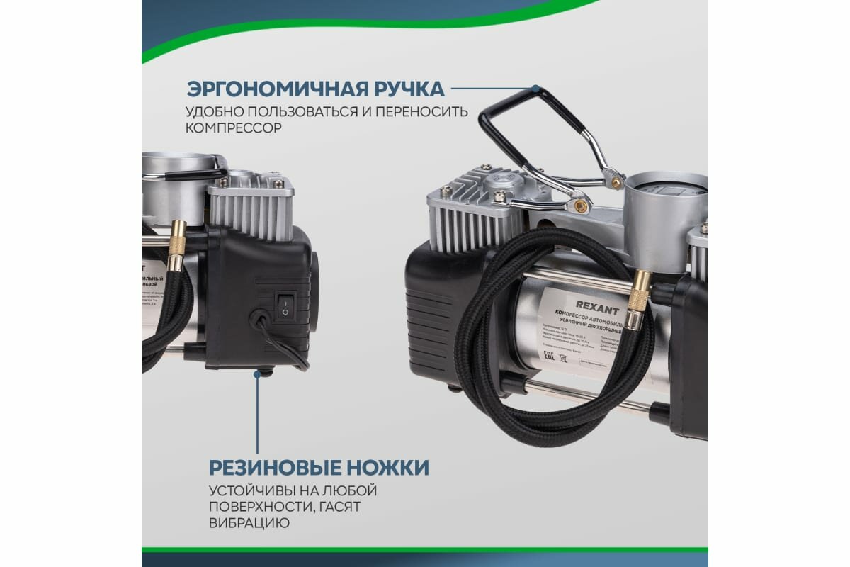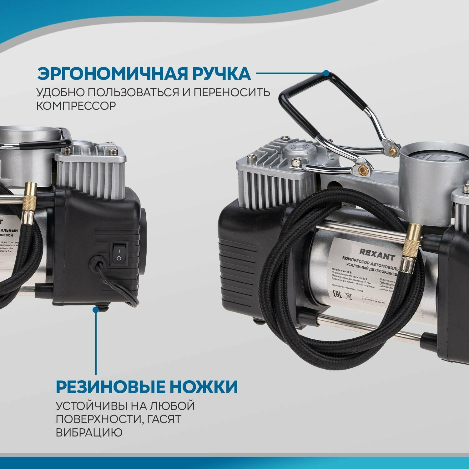 Компрессор автомобильный усиленный двухпоршневой REXANT / Насос для велосипеда, надувного матраса, мячей, надувной лодки 10 АТМ, 60л/мин
