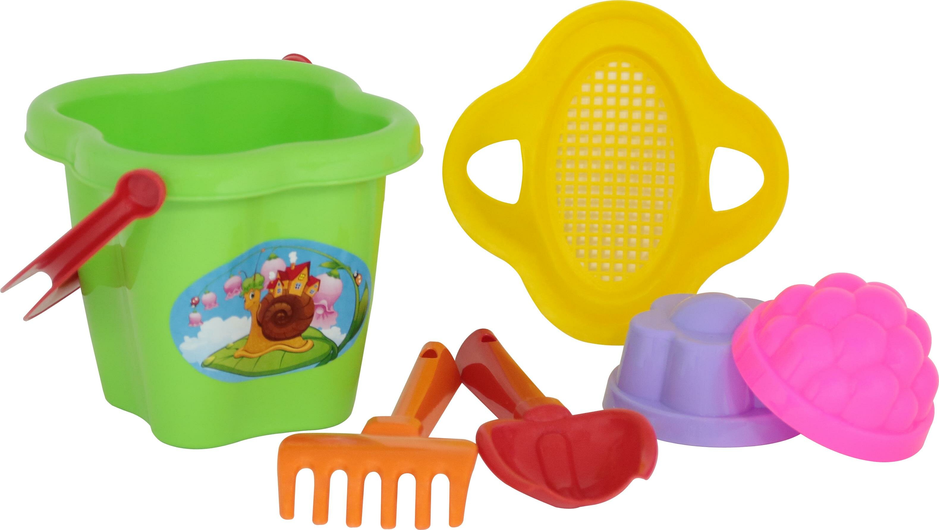 Набор №36: ведро-цветок среднее, ситечко-цветок, совок №2, грабельки №2, 2 формочки П-2280-no