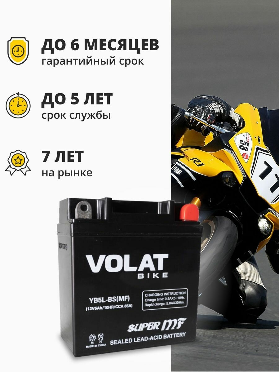 Аккумулятор для мотоцикла 12v Volat YB5L-BS(MF) обратная полярность 5 Ah 65 A AGM, акб на скутер, мопед, квадроцикл 119x60x129 мм интересное: