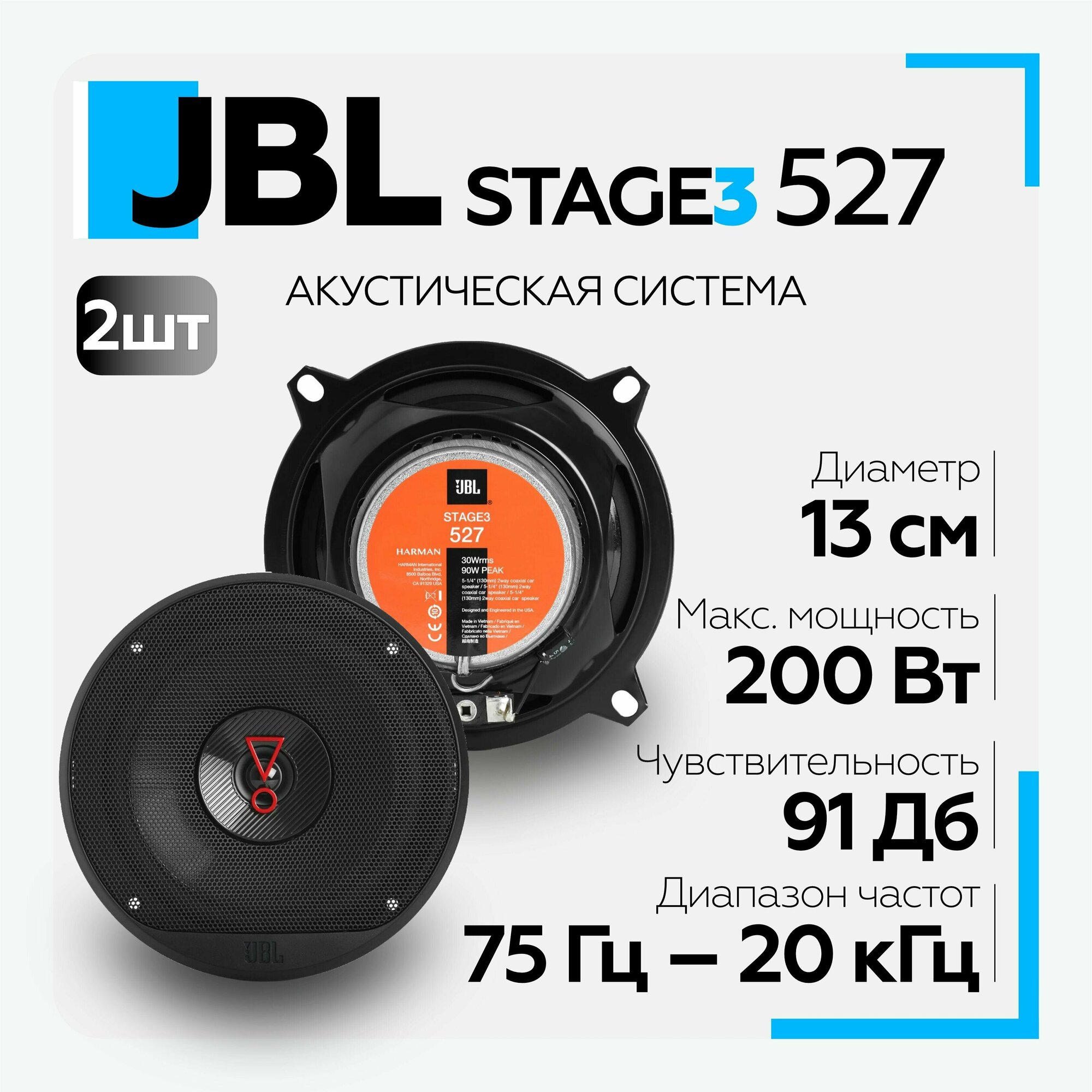 Купить 2-полосная коаксиальная автоакустика JBL Stage3 527 13см (5дюйм.) RMS 40Вт, 91 дБ