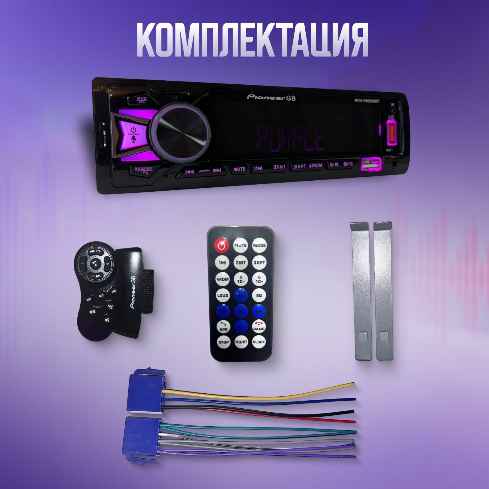 | Подробная комплектация | Магнитола 1дин 2 Пульта ДУ Фишки питания и звука ISO |