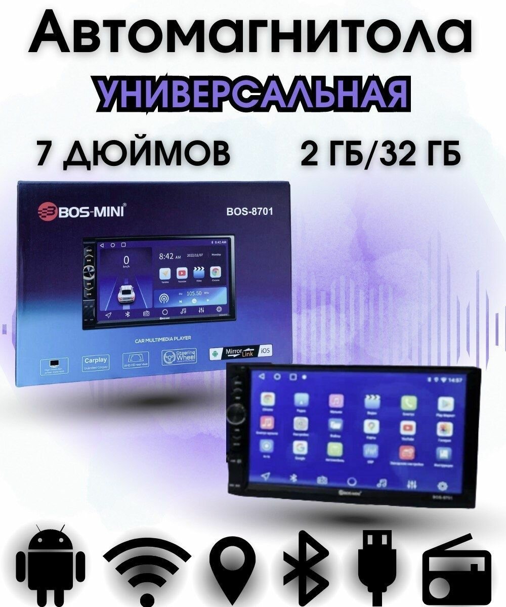 Купить Автомагнитола 2 DIN на Андройде 7 дюймов с крутилкой звука с CarPlay и Android AUTO Bos-Mini BOS-8701 память 2+32 BOS-8701