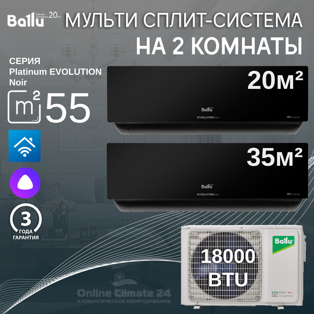 Инверторная мульти сплит-система BALLU на 2 комнаты (25 м2 + 25 м2) BA2OI-FM/out-18HN8/EU+BSUI-FM/in-09HN8/EU_BL*2, черный