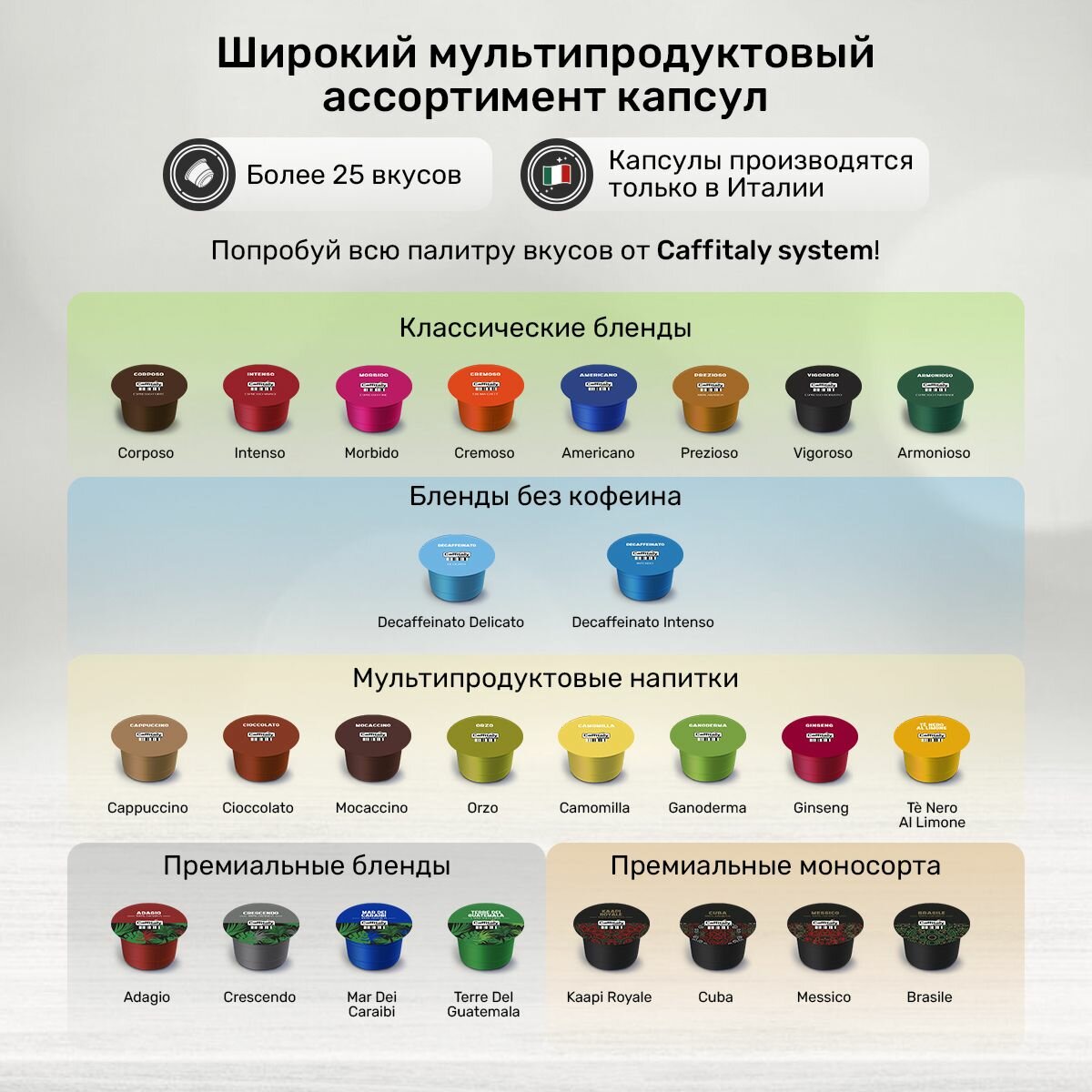 | Дополнительная информация | Совместимые капсулы следующих систем: Caffitaly; K-fee; Pauling,Рекомендованные производителем Оригинальные капсулы Caffitaly содержат больший объем кофе и имеют две мембраны для получения бархатистой пенки |