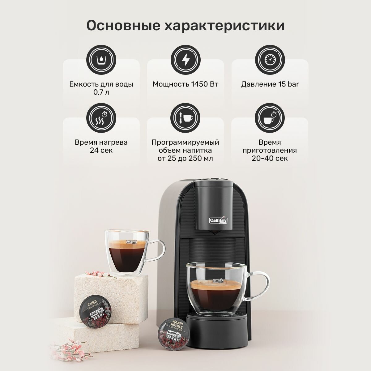| Дополнительная информация | Совместимые капсулы следующих систем: Caffitaly; K-fee; Pauling,Рекомендованные производителем Оригинальные капсулы Caffitaly содержат больший объем кофе и имеют две мембраны для получения бархатистой пенки |