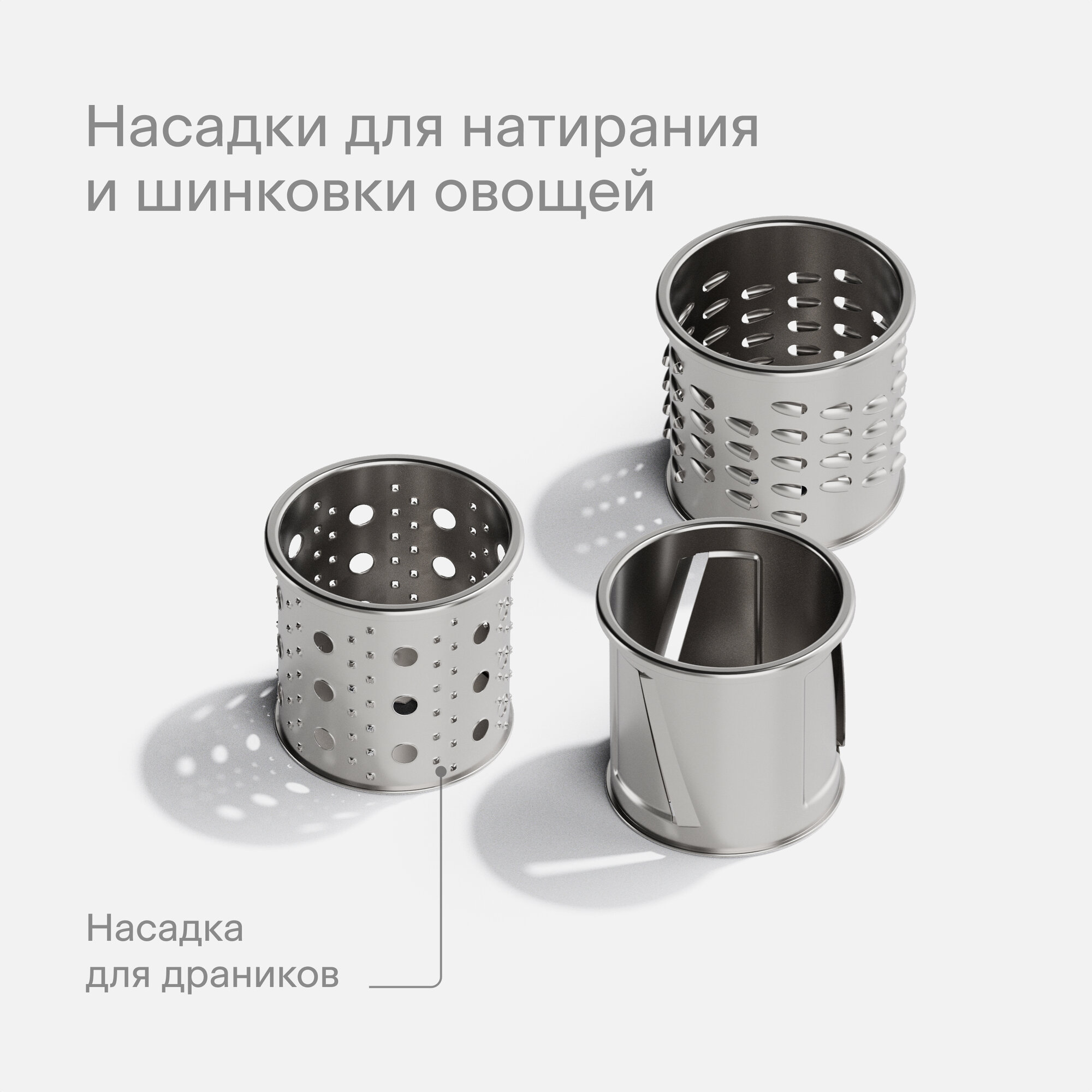 | Дополнительная информация | ножки-присоски, овощерезка, насадка для драников, терка, шинковка, насадка для кеббе и колбас, 2 диска в комплекте, металлический лоток |