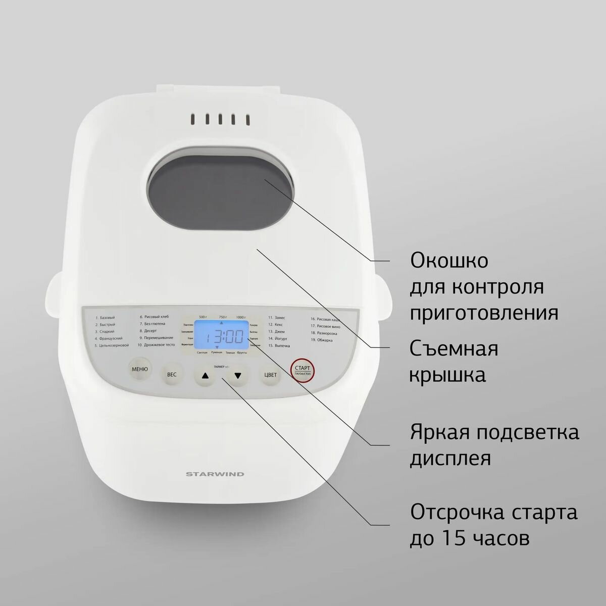 | Особенности | выбор цвета корочки / поддержание температуры / регулировка веса выпечки / таймер |