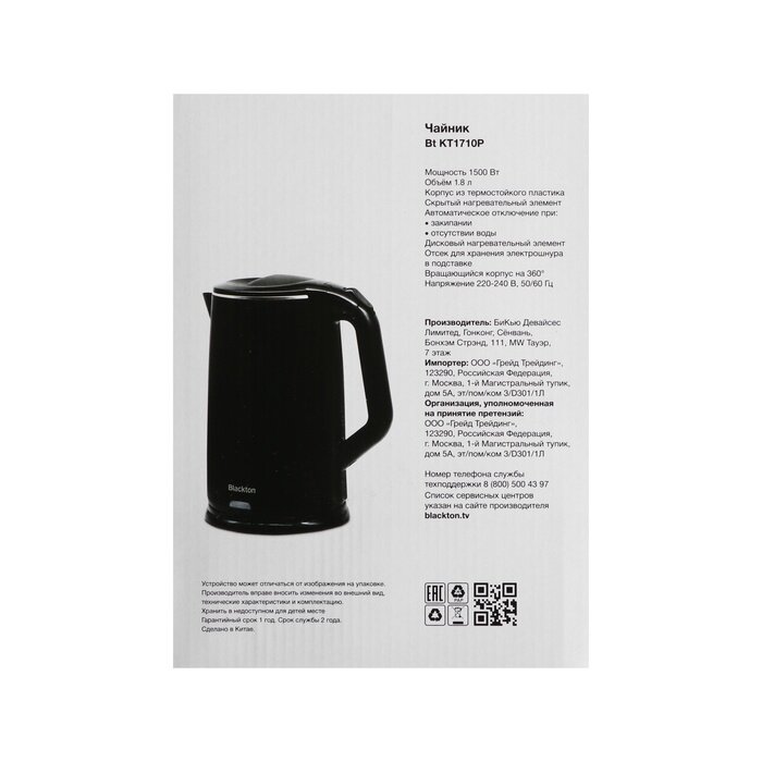 Чайник электрический Blackton Bt KT1710P Белый / Двухслойный / 1.8 л 1500 Вт