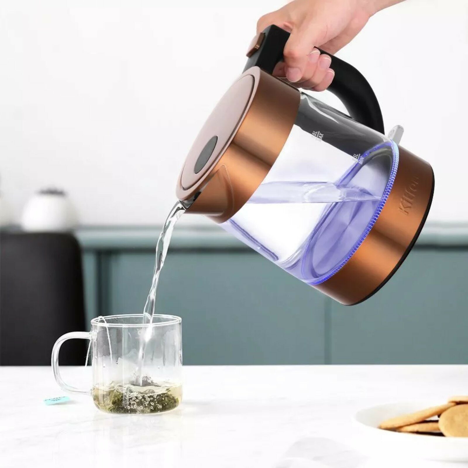 Чайник KITFORT КТ-648, 1 л, 2200 Вт, закрытый нагревательный элемент, терморегулятор, стекло, серебристый