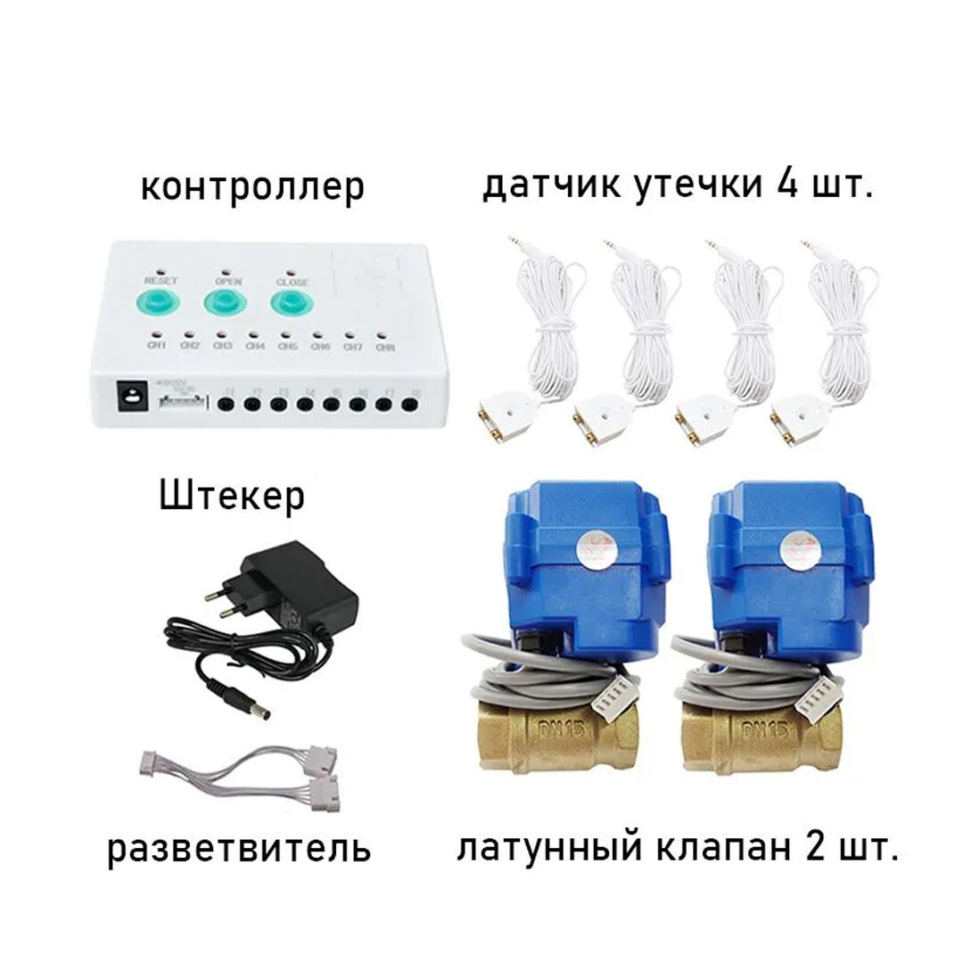 | Подробная комплектация | 2 крана с электроприводом 1/2''; 4 датчика протечки воды; блок управления; адаптер питания |