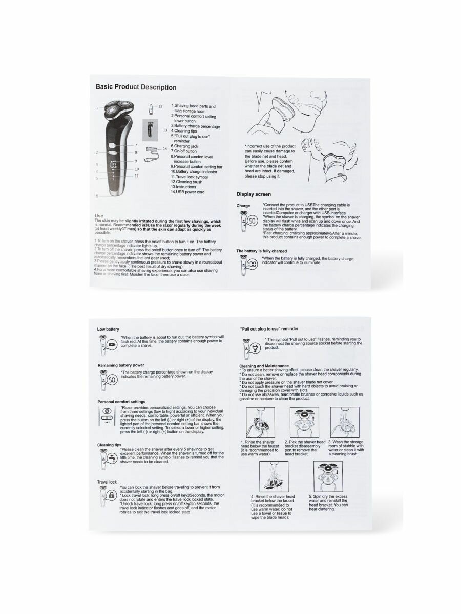 | Особенности | быстрая зарядка / дисплей / для чувствительной кожи / индукционная зарядка / насадка для стрижки волос / нескользящая вставка на рукоятке / питание от USB / триммер |
