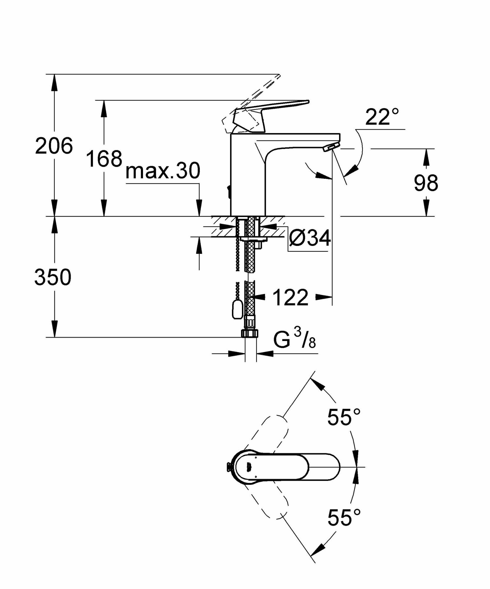 Смеситель для раковины однорычажный, с цепочкой, хром, Grohe Eurosmart Cosmopolitan 23326000