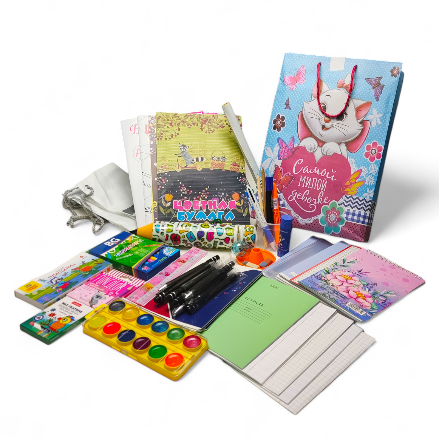 | В комплекте | 1.Альбом для рисования – 2 шт 2.Цветная бумага. -1 шт 3.Белый картон. – 1 шт 4.Картон цветной. – 1 шт 5.Тетрадь в клетку. – 5 шт 6.Тетрадь в линейку.– 20 шт .Обложки для тетрадей– 5 шт 8.Пластилин классический. Россия – 1 шт 9.Карандаши цветные – 1 шт 10.Краски акварельные – 1 шт 11.Линейка пластиковая – 2 шт 12.Карандаш простой -10шт 13.Ластик – 2 шт 14.Ручка шариковая (синяя).– 20 шт 15.Ручка шариковая (красная). – 1 шт 16.Ручка шариковая (зеленая). – 1 шт 17.Ручка шариковая (черная). – 1 шт 18.Кисть для рисования.– 1 шт 19.Пакет подарочный. Россия – 1 шт 20. Мешок для сменки. - 1 шт 21. Блокнот -2шт 22. Баночка не проливайка 1 секционная -1шт 23. Клей -1шт 24. Пенал -1шт 25. Корректирующая лента -1шт 26. Подставка для книг -1шт |