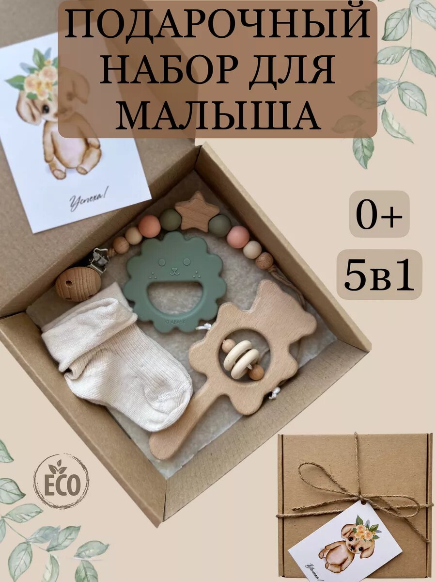 | Комплектация | Держатель для пустышки,, силиконовый прорезыватель, деревяная погремушка, носки, открытка |