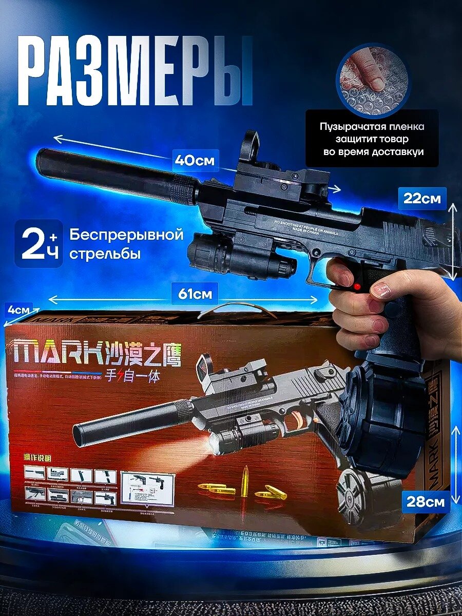 | Дополнительная информация | детский игрушечный пистолет, развлечения для детей, развивающий, начальная скорость 44 м/с, дульная энергия 0,4 Дж, 300 выстрелов в минуту, имитация реального выстрела |