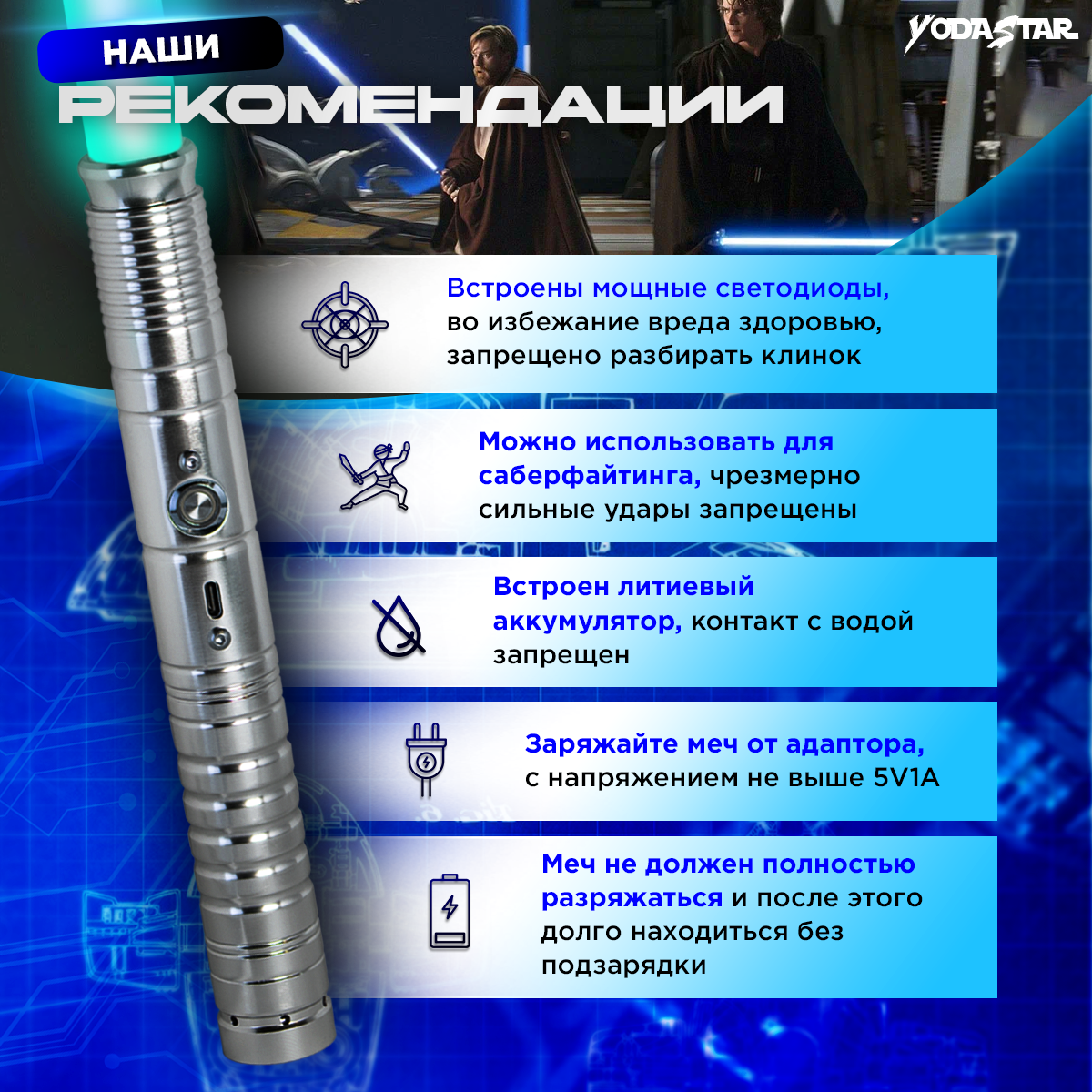 | Комплектация | световой меч (рукоятка, сабля), зарядное устройство, инструкция |