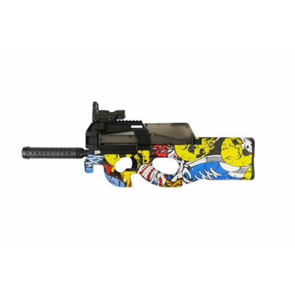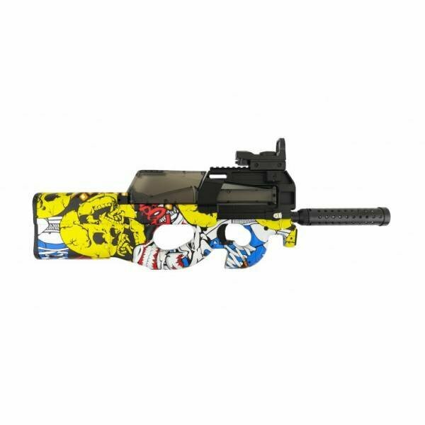 | Комплектация | Автомат Р90 на гидрогелевых шариках. Аккумулятор USB. Зарядный кабель. Коллиматорный прицел. Насадка "глушитель" на ствол. Защитные очки. Ремень. Емкость для выращивания орбизов. Начальный набор шариков орбиз. |