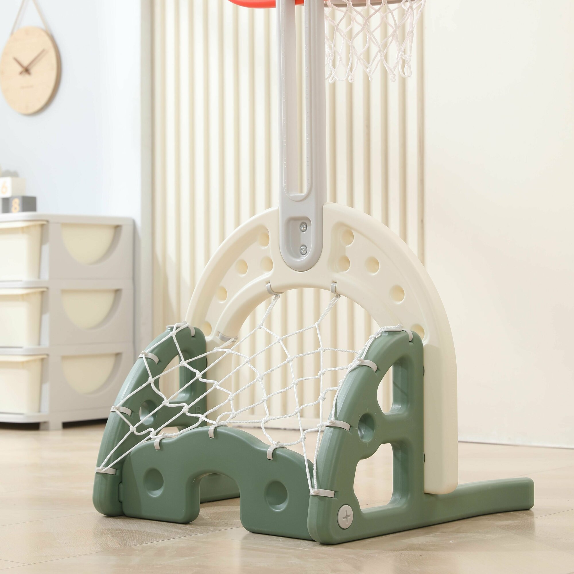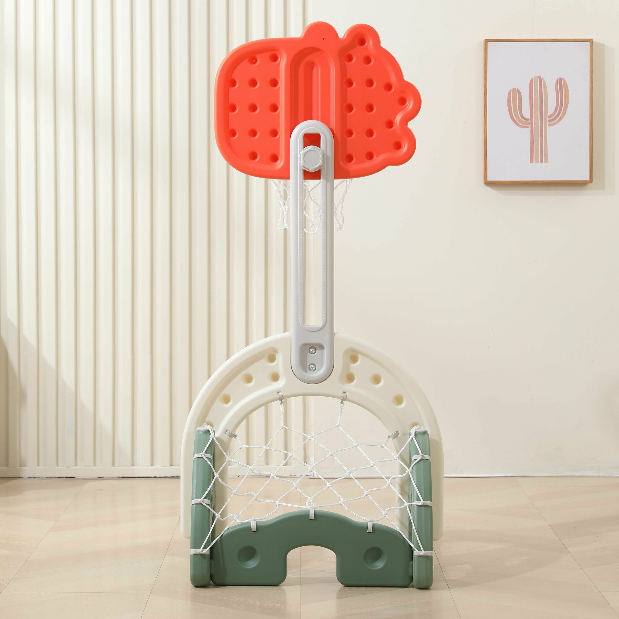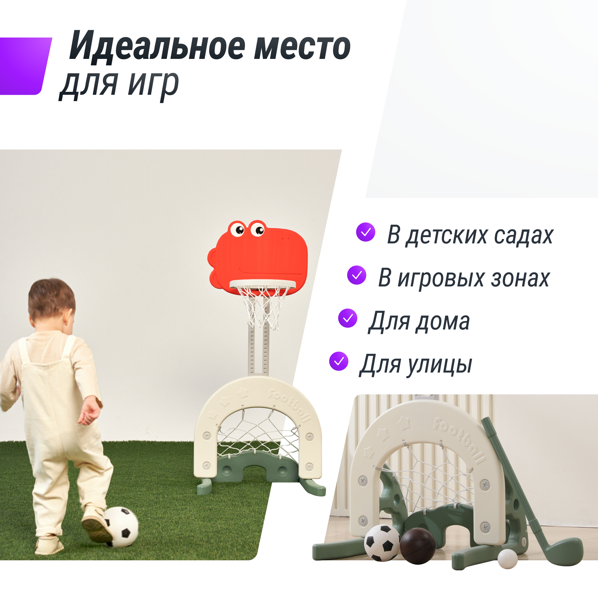 | Комплектация | детская баскетбольная стойка, футбольный и баскетбольный мячи, клюшка, маленький мяч-шайба |