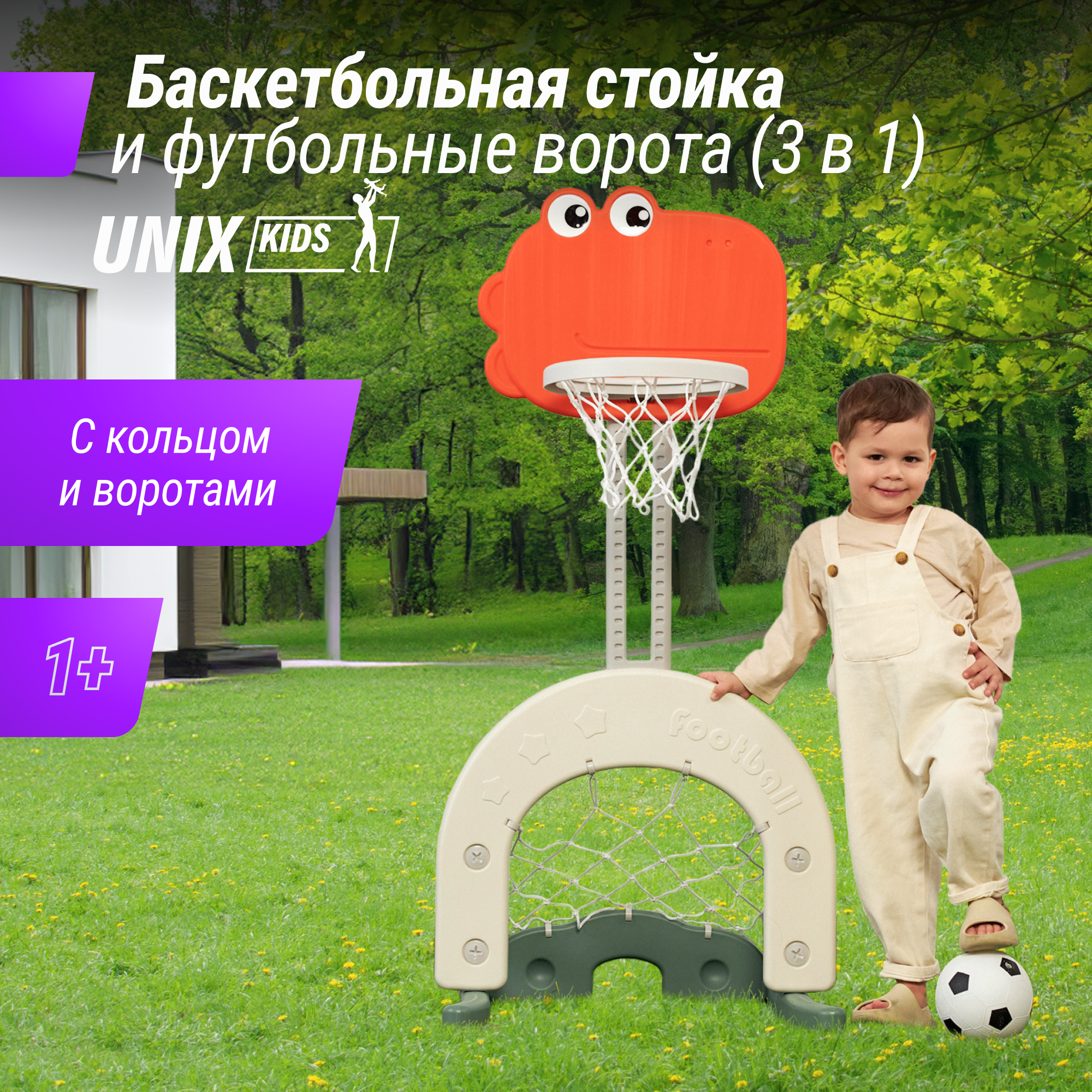 Купить Баскетбольная стойка UNIX Kids Dino (3 в 1) Хоккейные ворота/Футбольные ворота для дома, для улицы / игровой комплекс 3 в 1
