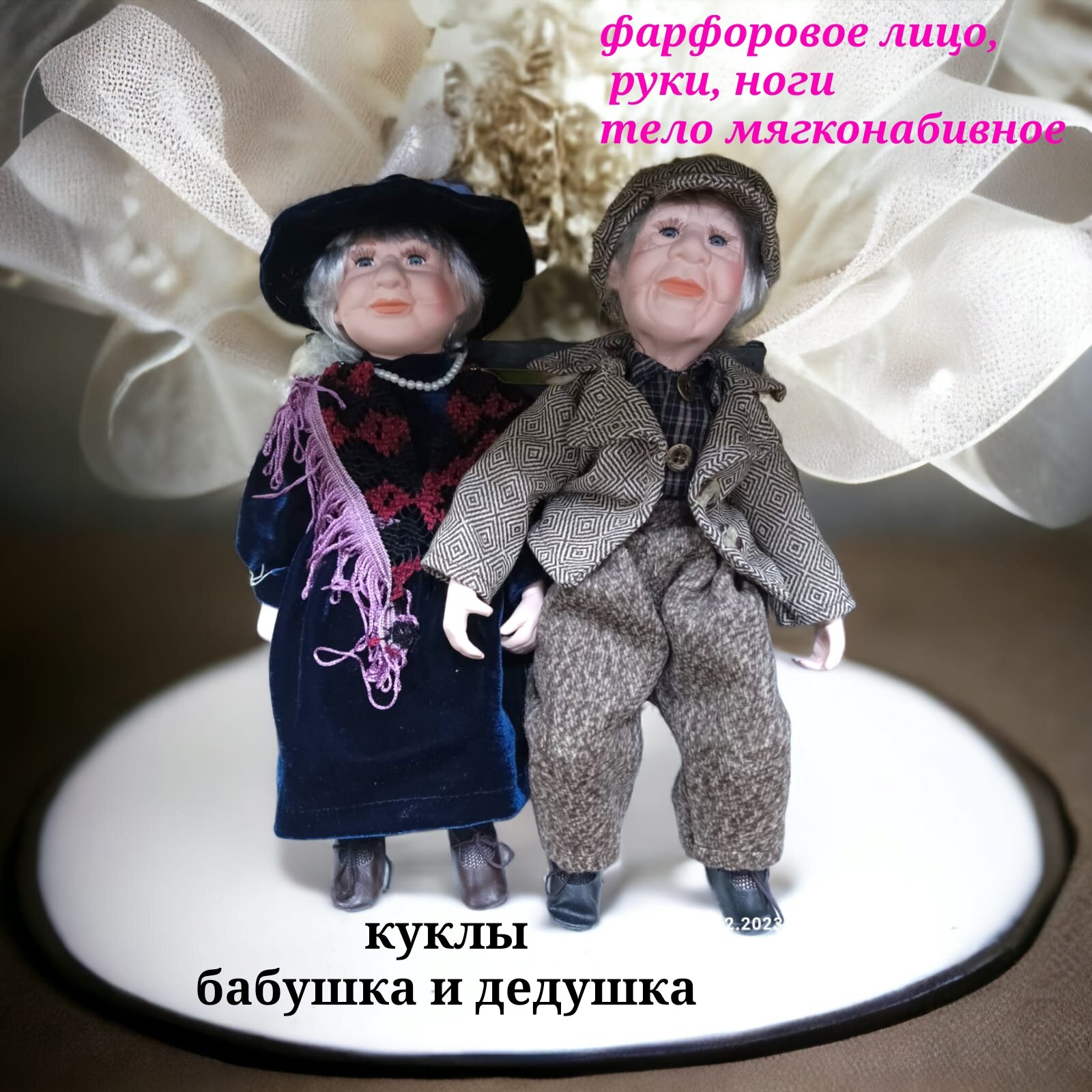 Фарфоровые коллекционные куклы Бабушка с дедушкой на скамейке 35 см интересное: