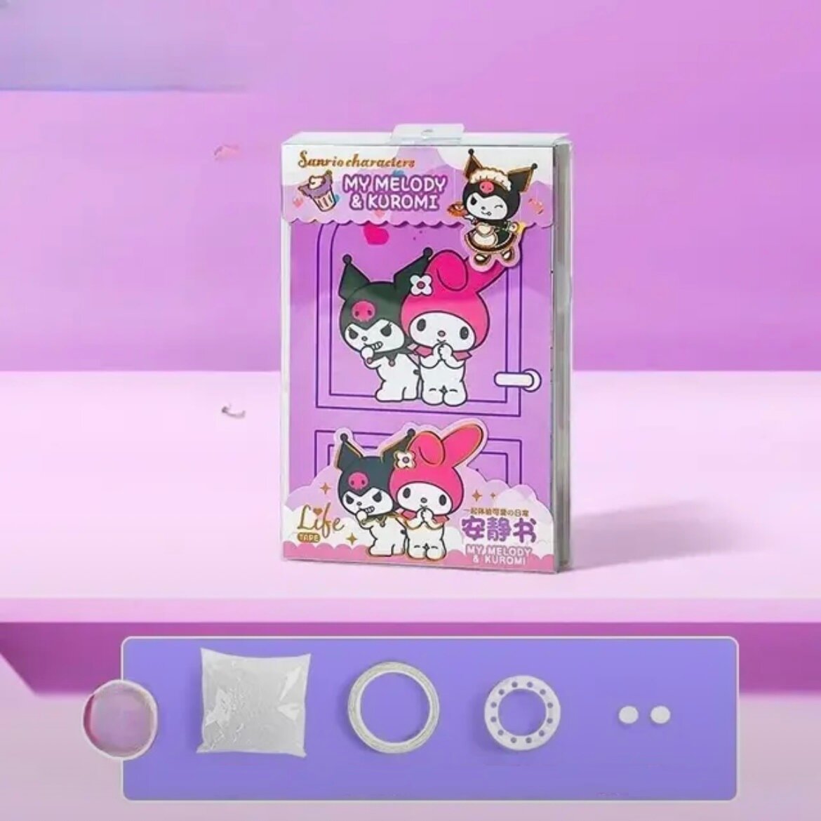 | Комплектация | Бумажные куклы Куроми и мелоди; карточки с разными локациями; фигурки - аксессуары, одежда, еда, посуда и т.д.; скотч; двусторонний скотч; липучки; синтепон. |