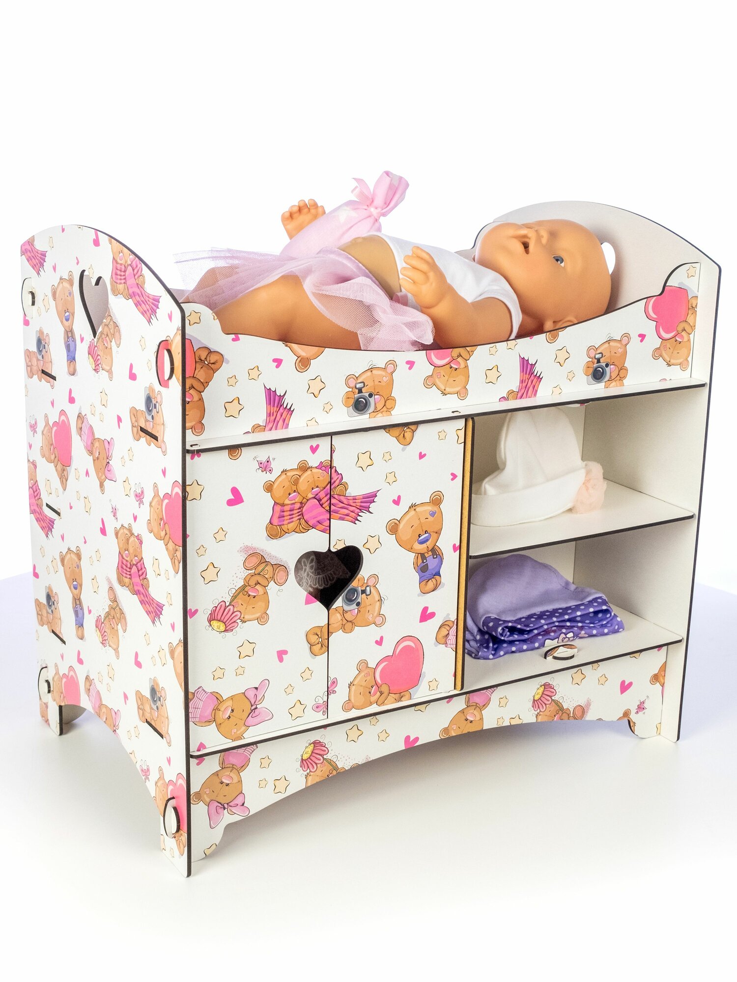 Купить Кроватка для кукол до 45 см "Мишки" со шкафом и полками, 2-х сторонняя