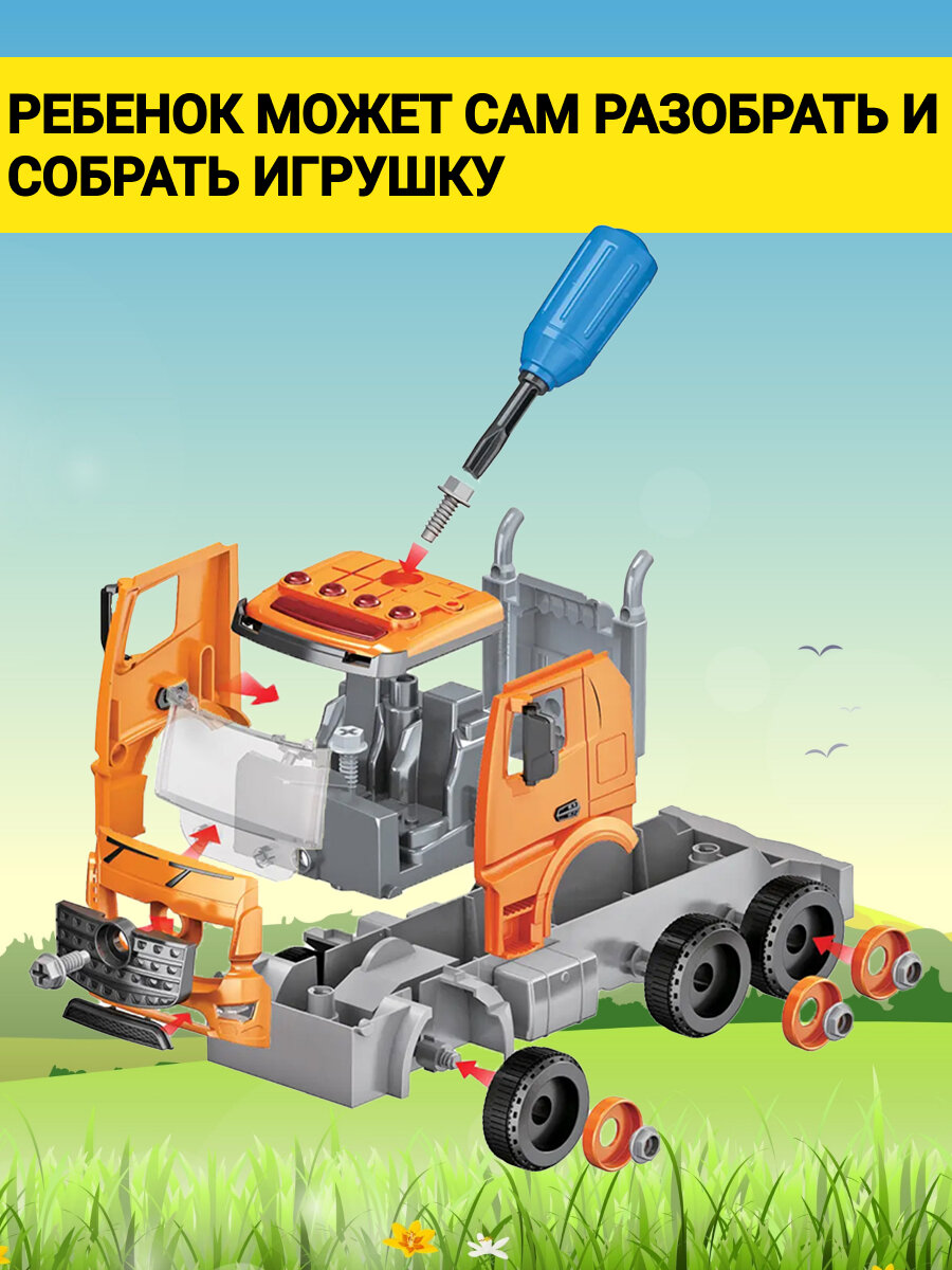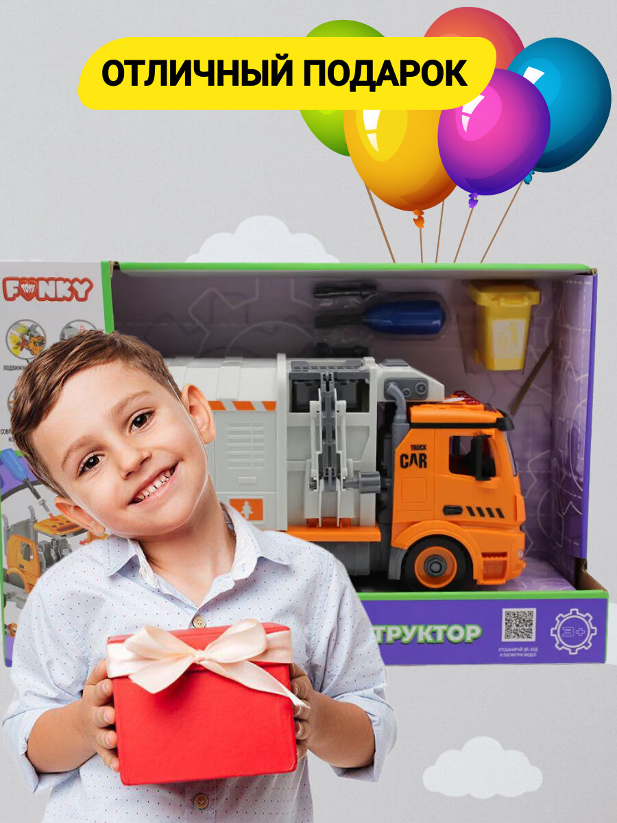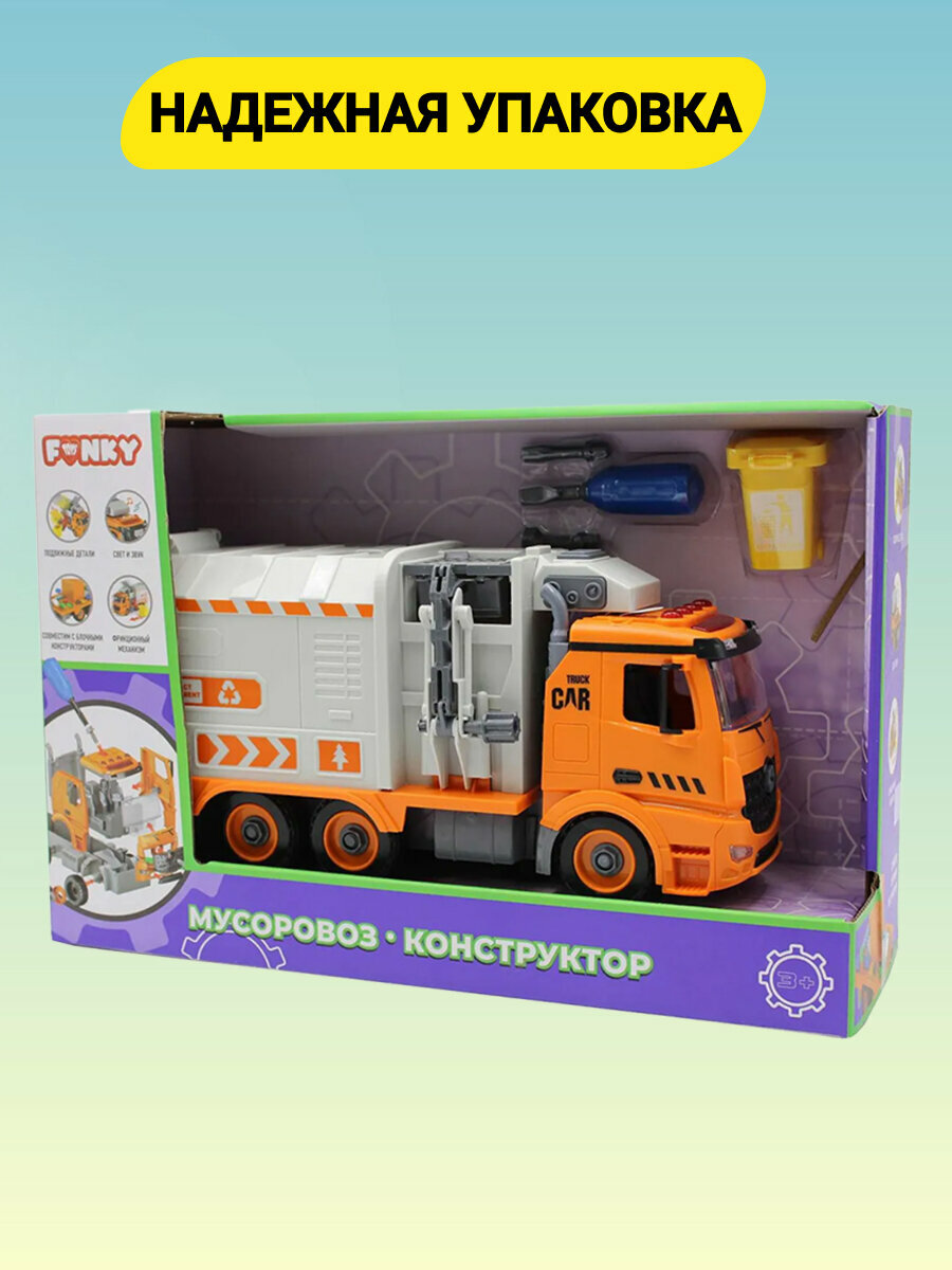 Машинка детская конструктор мусоровоз, игрушка Funky Toys, фрикционный, звук, свет, 1:12 интересное: