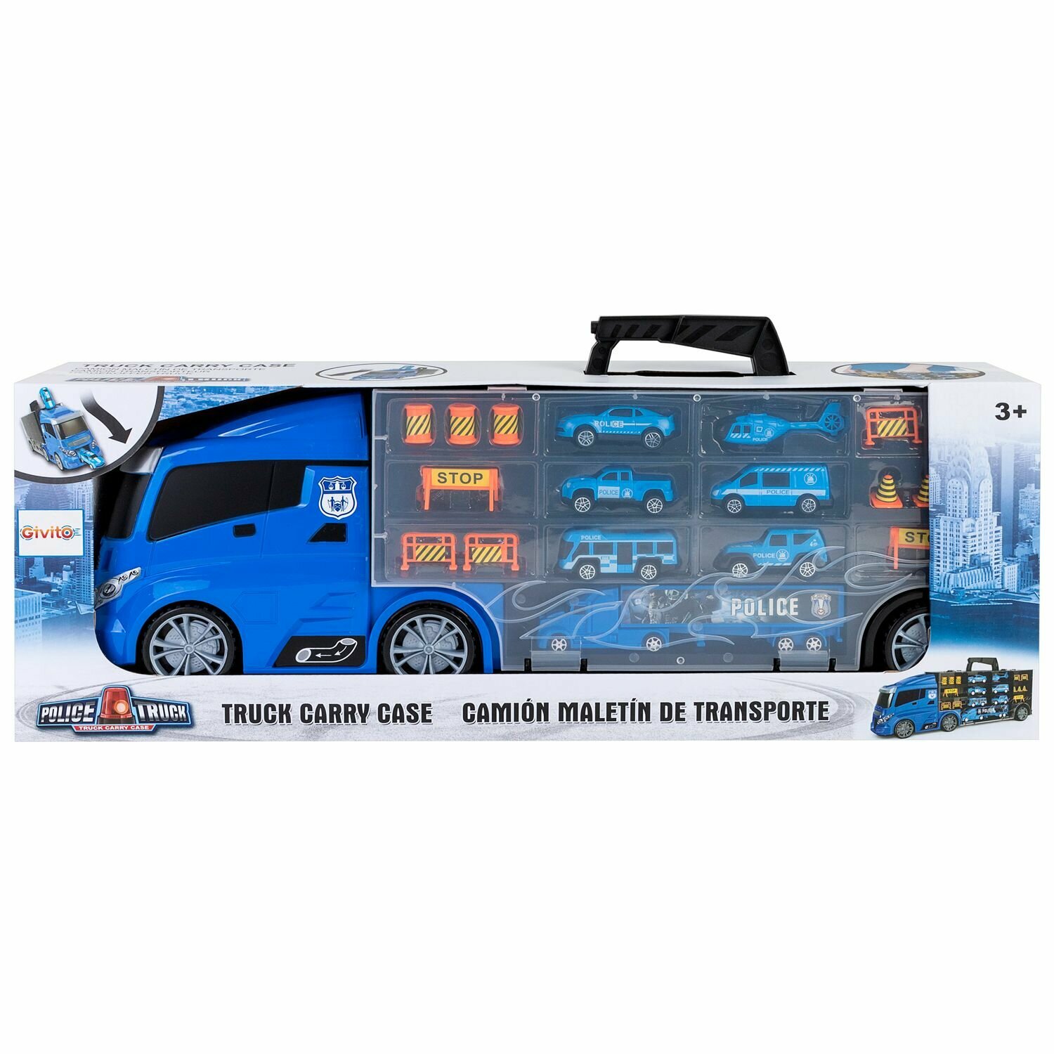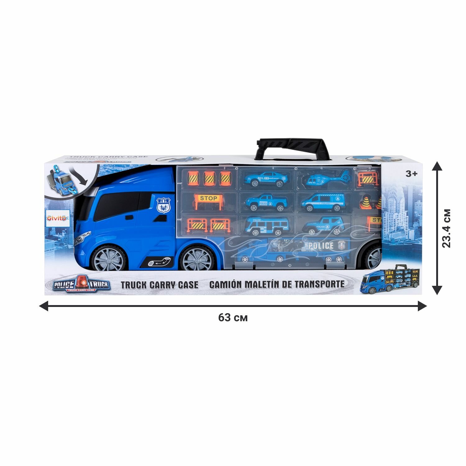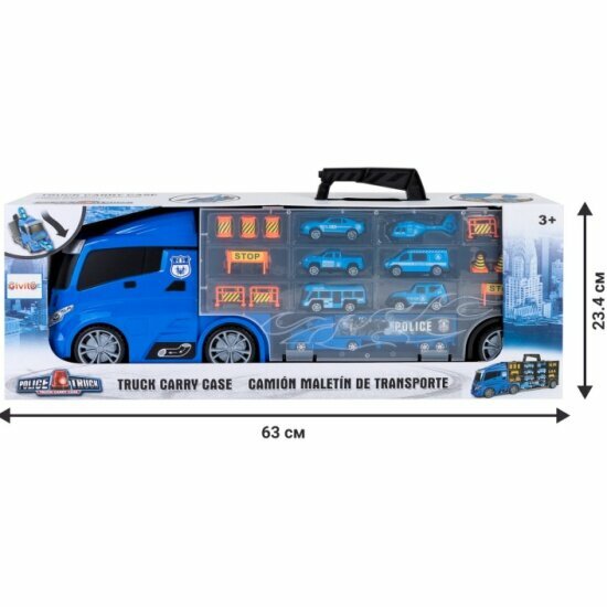 Машина-автовоз Givito "Полицейский участок" (Автовоз - кейс 59 см, синий, с тоннелем, машинки, дорожные знаки в комплекте)