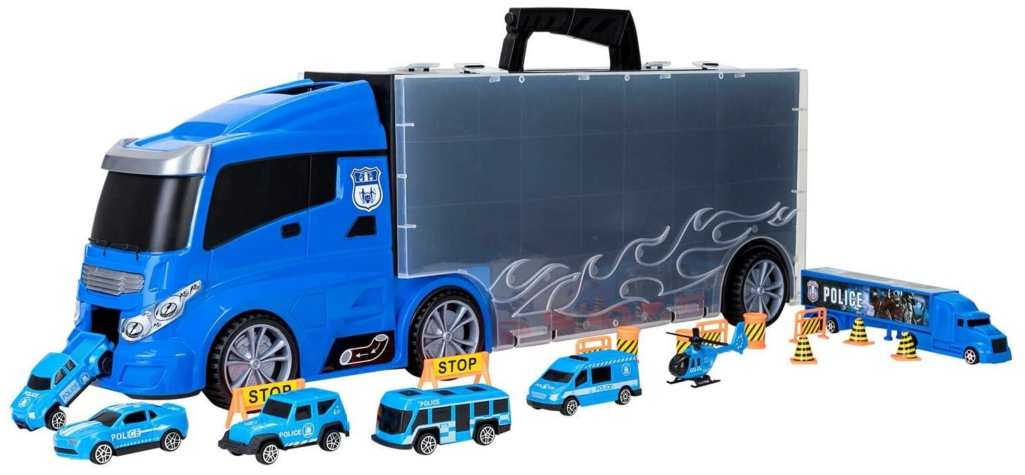 Купить Машина игрушка серии "Полицейский участок" (Автовоз - кейс 59 см, синий, с тоннелем. Набор из 4 машинок, 1 автобуса, 1 вертолета, 1 фуры и 12 дорожных