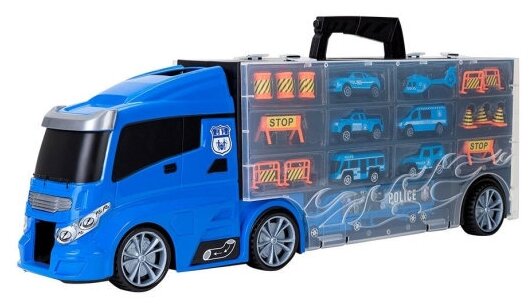 Машина игрушка серии "Полицейский участок" (Автовоз - кейс 59 см, синий, с тоннелем. Набор из 4 машинок, 1 автобуса, 1 вертолета, 1 фуры и 12 дорожных интересное: