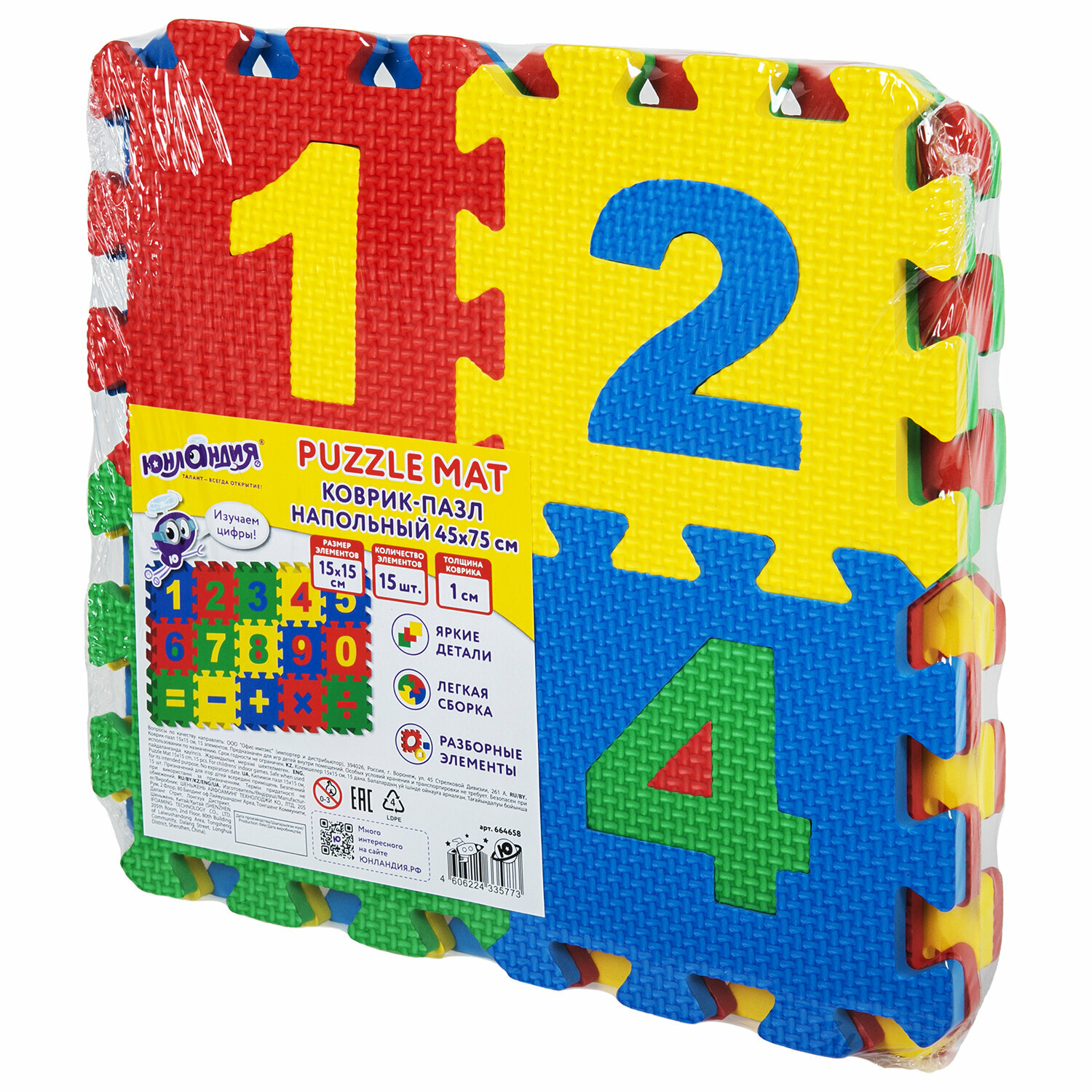 Купить Коврик-пазл Юнландия напольный 0,75х0,45 м, мягкий, "Учим цифры" 15 частей, 15х15 см, 1 см (664658)