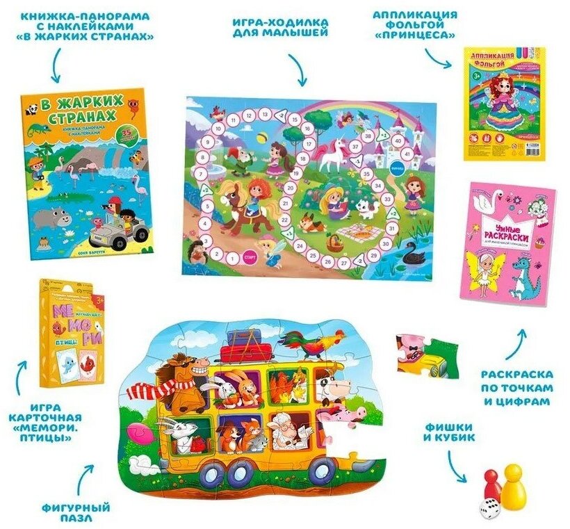 | Комплектация | игра-ходилка, раскраска по точкам и цифрам, игра Мемори, книжка-панорама с наклейками, аппликация фольгой, фигурный пазл Зверотур |