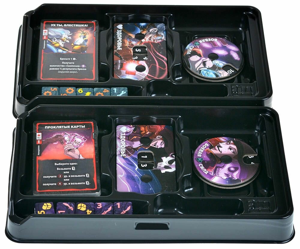 | Комплектация | 10 кубиков 2 счётчика здоровья 2 счётчика боевой силы 2 планшета героя 2 памятки героя 2 карты порядка хода 64 карты героя 2 набора жетонов героя |