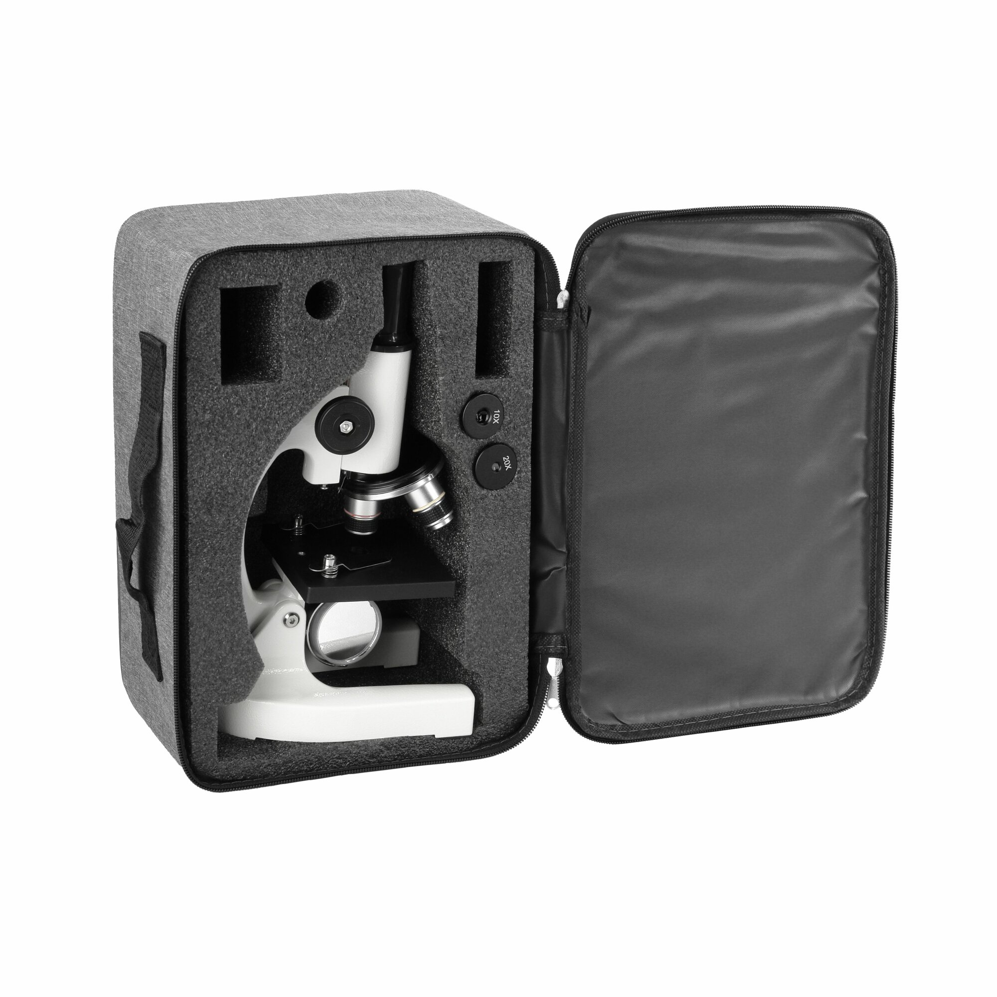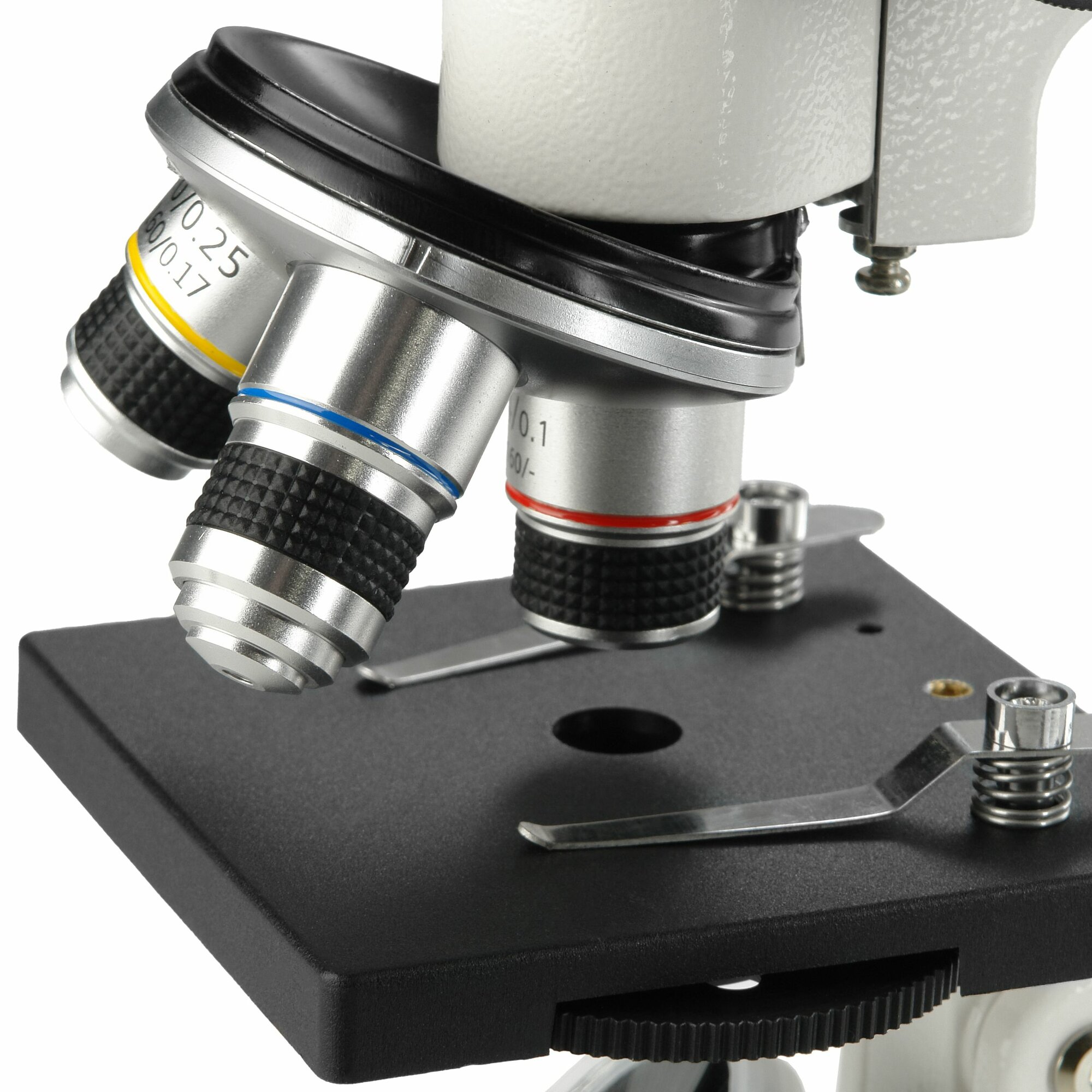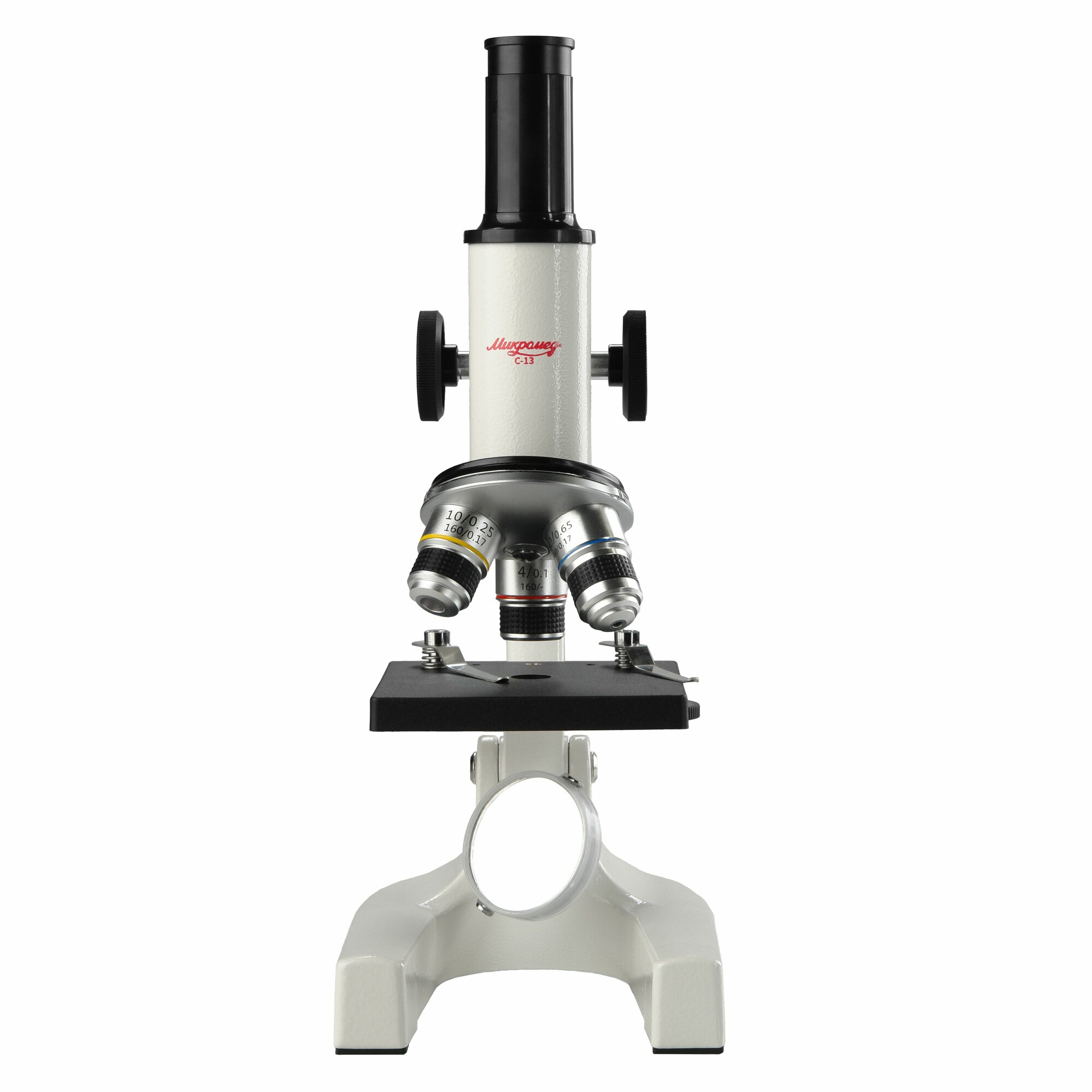 | Комплектация | Штатив и основание микроскопа с окулярным тубусом и револьвером на 3 гнезда Зеркальце в оправе с держателем Столик 90х90 с диском диафрагм и клеммами Объектив - ахромат 4х/0.1 Объектив - ахромат 10/0.25 Объектив - ахромат S40/0.65 Окуляр 10х/18 Окуляр 20х/11 Кейс текстильный Главная книга юного биолога |
