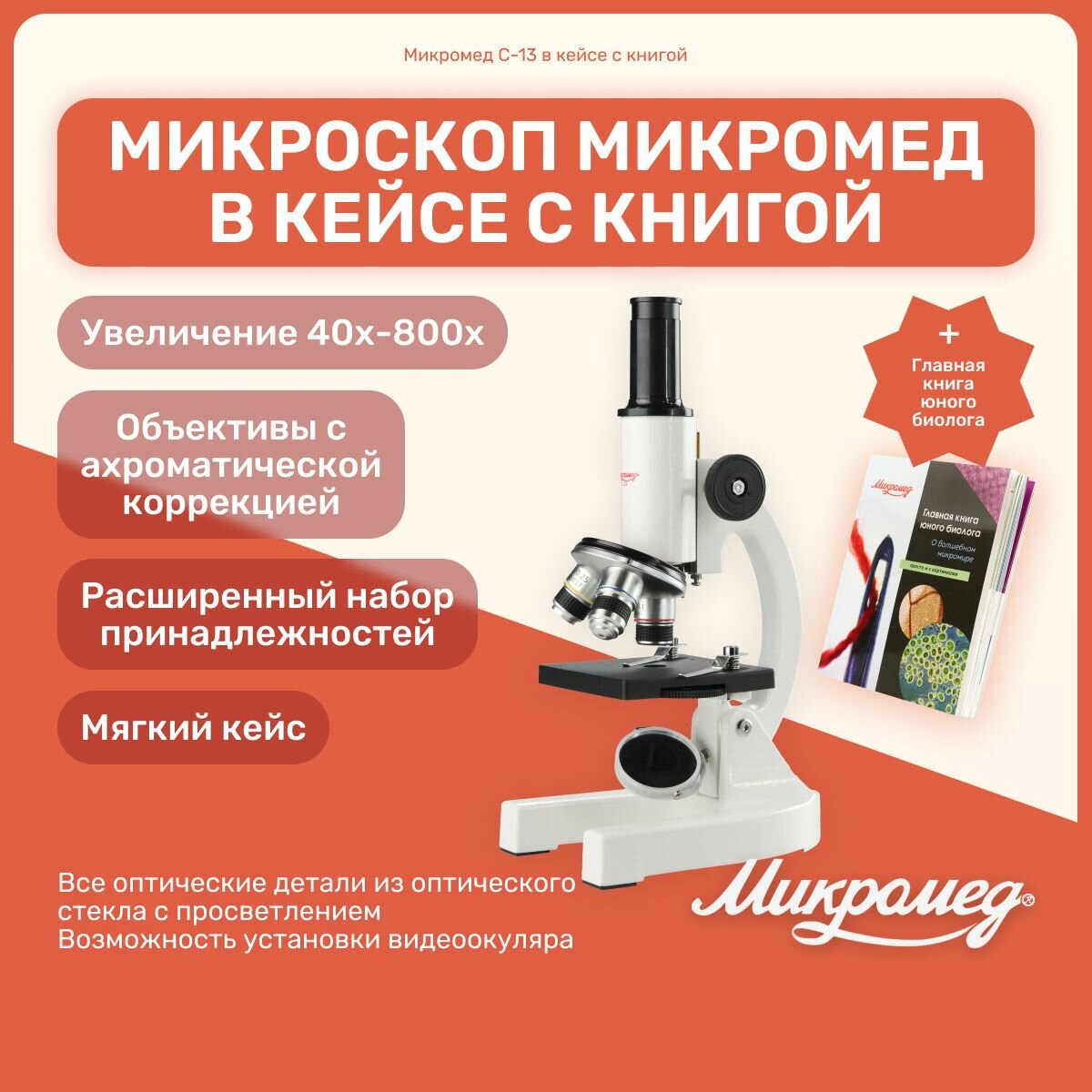Микроскоп биологический Микромед С-13 в кейсе с книгой, лабораторный, для исследований, профессиональный, металлический интересное: