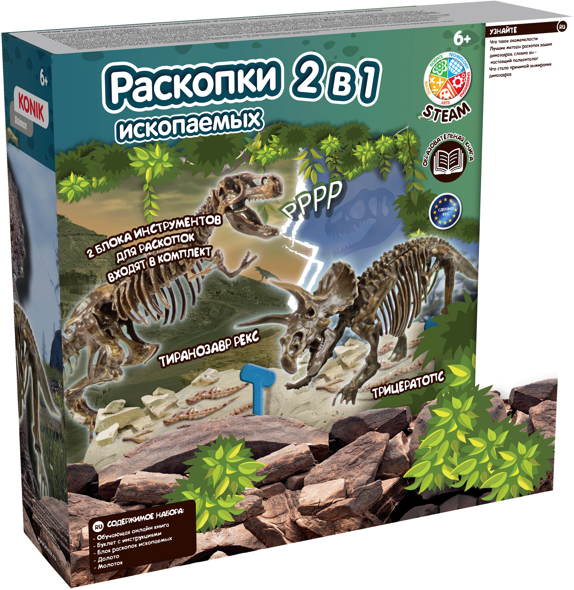 | Комплектация | Содержимое набора: обучающая онлайн книга; буклет с инструкциями; блок раскопок ископаемых; долото; молоток |