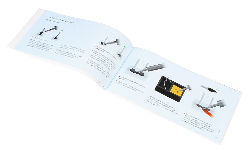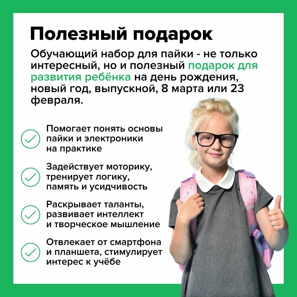 | Комплектация | Комплектация подарочного DIY паяльного набора: паяльник Stayer MAXTerm (25 Вт) – 1 шт., макетная плата Breadboard PCB (830 точек пайки) – 1 шт., жидкий флюс ЛТИ-120 с кисточкой – 1 шт., припой с флюсом (20 г / 2 м) – 4 шт., подставка для паяльника с губкой – 1 шт., «третья рука» (зажим с лупой) – 1 шт., оловоотсос – 1 шт., медная оплётка – 1 шт., пинцет – 1 шт., бокорезы – 1 шт., защитные очки – 1 шт., комплект резисторов – 1 уп., комплект микросхем – 1 уп., комплект светодиодов – 1 уп., кабель питания от батарейки 9V крона – 1 шт., батарейка «Крона» 9В – 1 шт. |