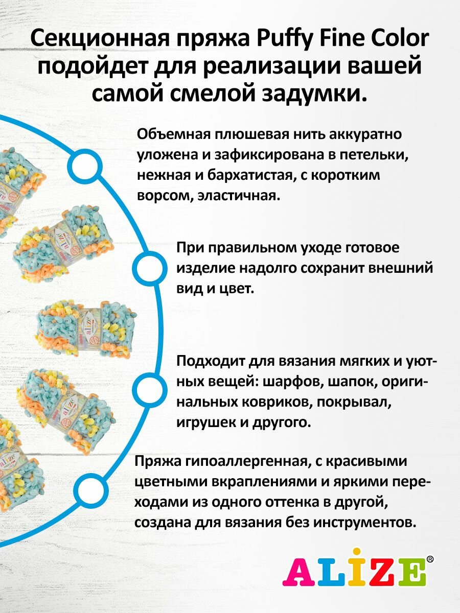 Пряжа для вязания плюшевая с петельками Alize Puffy Fine Color, цвет 6383, 100г, 14,5м, 5 шт/упак