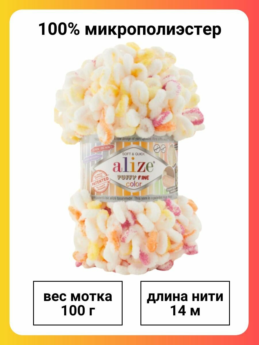 Пряжа Alize Puffy fine color белый-жёлтый-розовый (6367), 100%микрополиэстер, 14.5м, 100г, 1шт