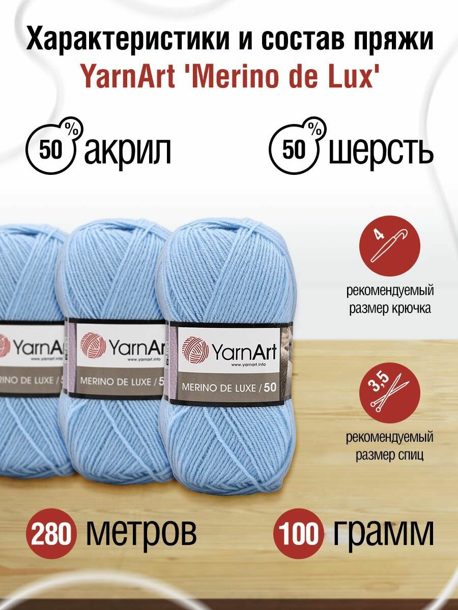 Пряжа YarnArt Merino de Luxe 50 (Ярнарт Мерино де Люкс) 100г, 280м, 50% шерсть 50% акрил, цвет 215 св. голубой, 1 шт.
