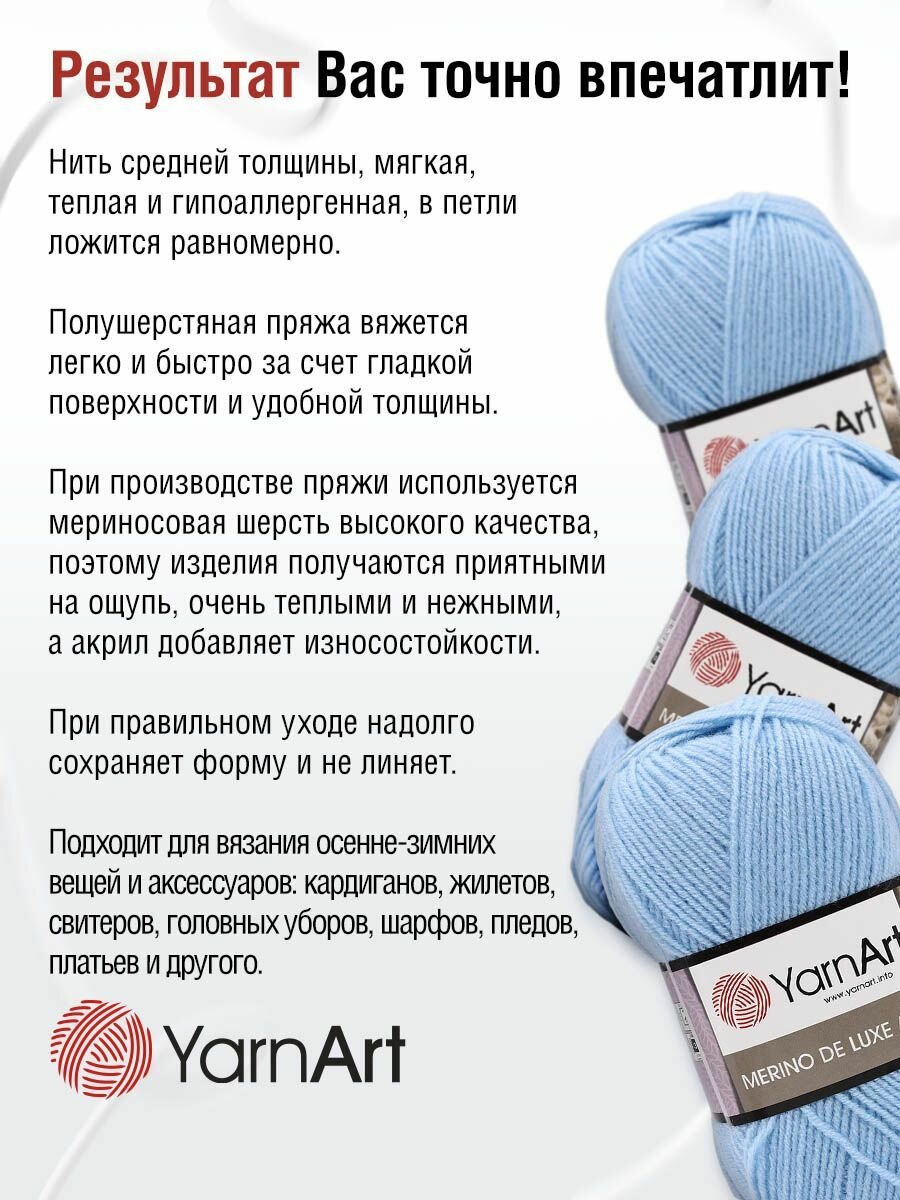 СохранитьПряжа Yarnart Merino De LUXE светло-голубой (0215), 50%шерсть/50%акрил, 280м, 100г, 5шт интересное: