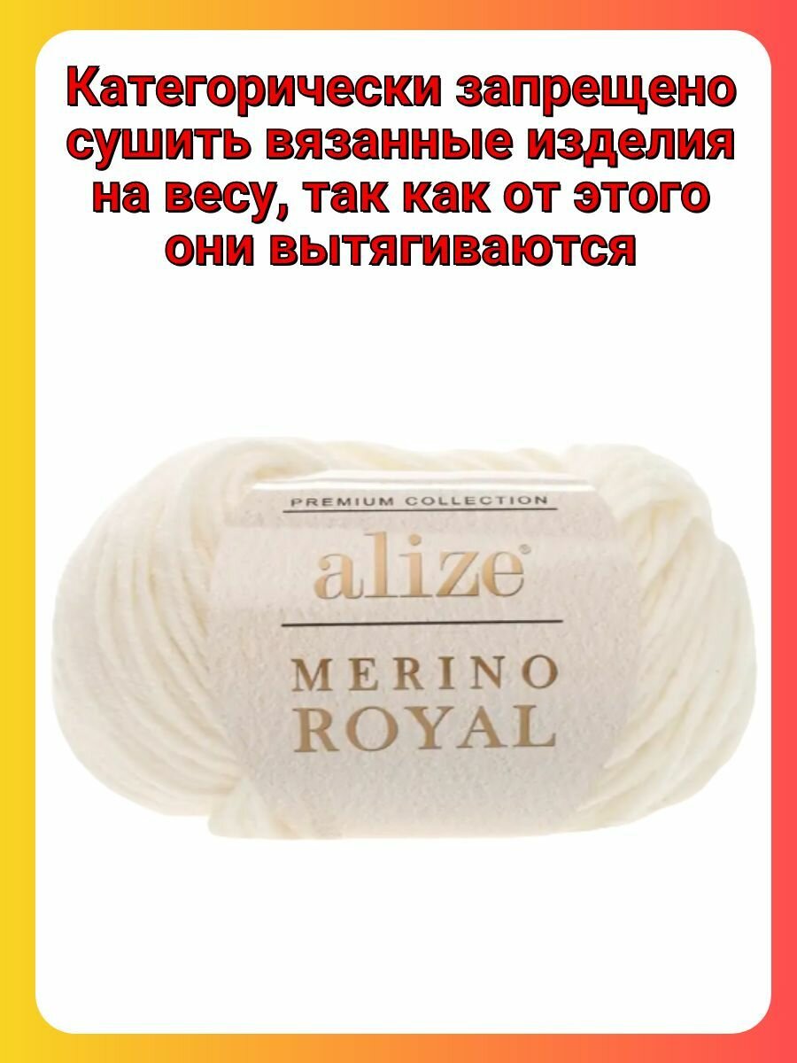 Мериносовая пряжа для вязания Alize Merino Royal, цвет 62 молочный, моток 50г, 100м, 10 мотков/упак