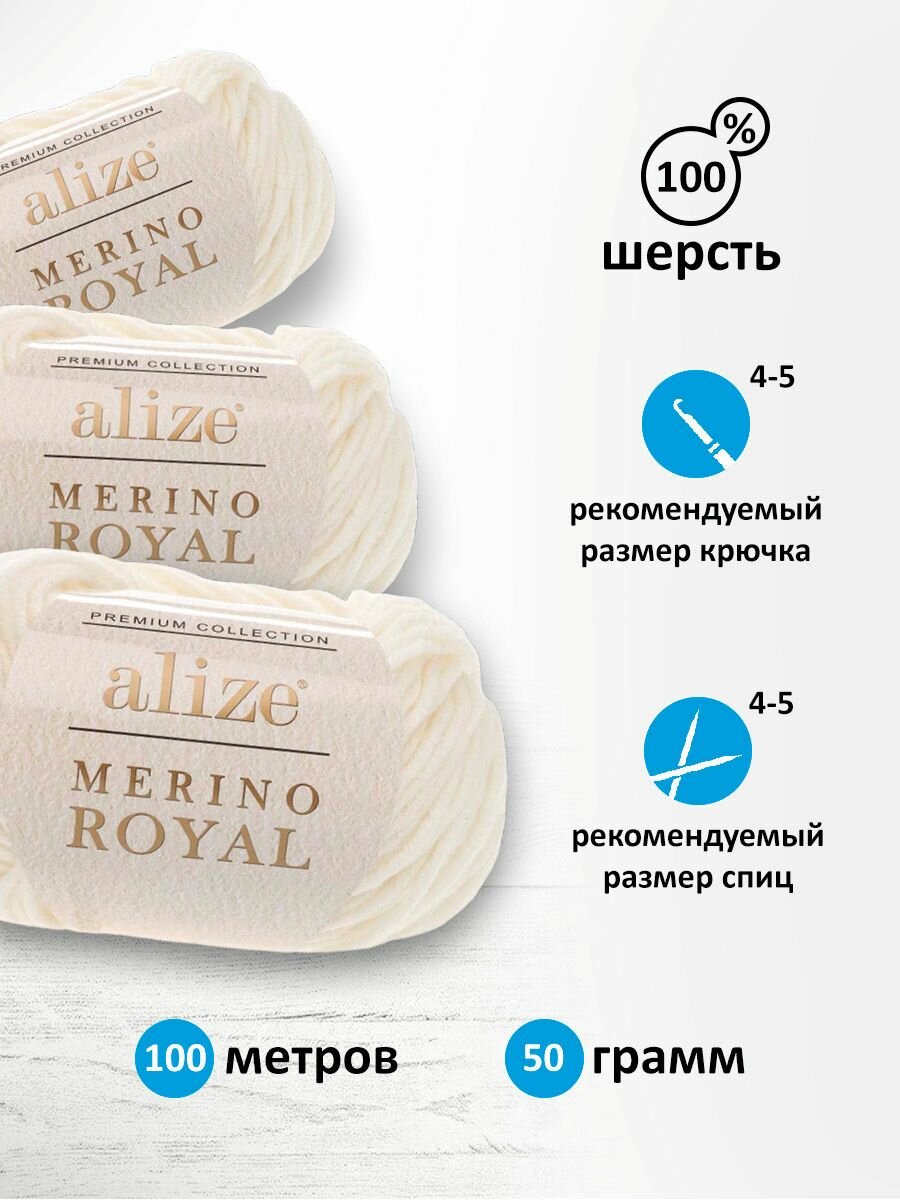 Пряжа для вязания крючком, спицами Alize Ализе Merino royal средняя, шерсть 100%, цвет 67 экрю, 5 шт. по 50 г, 100 м