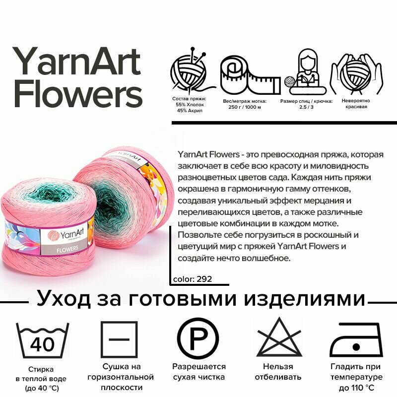 СохранитьПряжа YarnArt Flowers коралл-бирюза (292), 55%хлопок/45%акрил, 1000м, 250г, 1шт интересное: