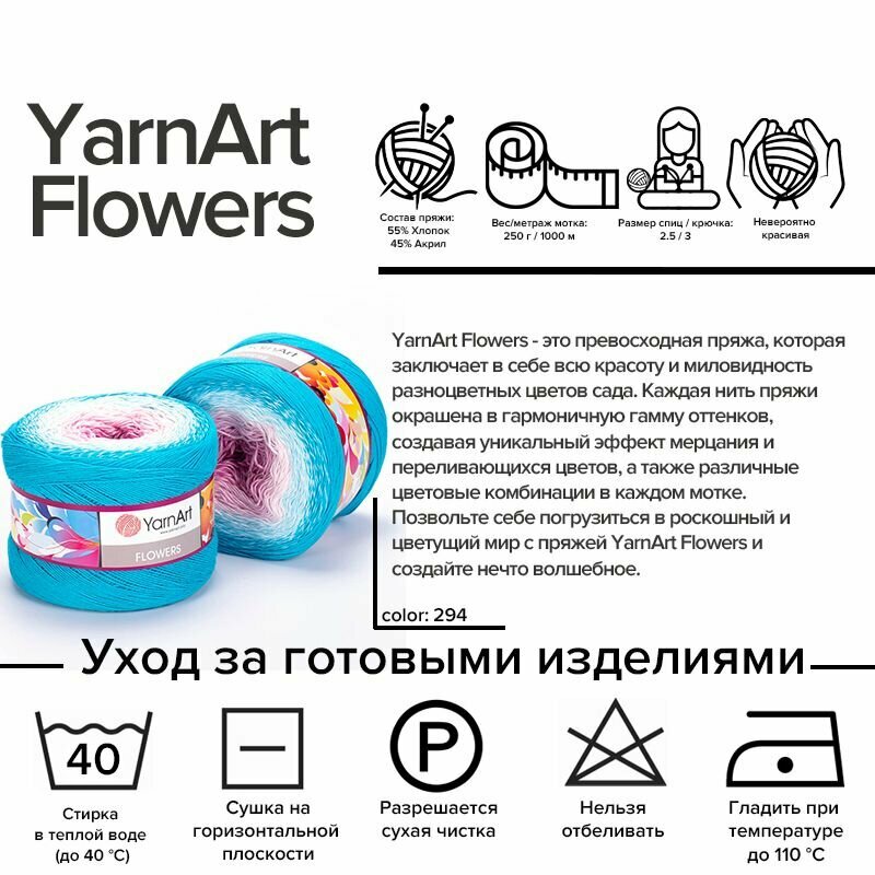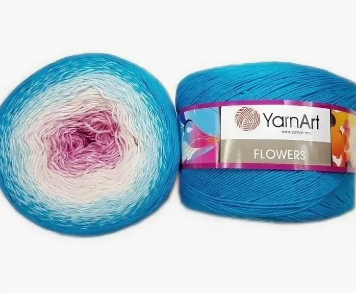 Купить Пряжа YarnArt Flowers голубая бирюза-розовый-фуксия (294), 55%хлопок/45%акрил, 1000м, 250г, 1шт
