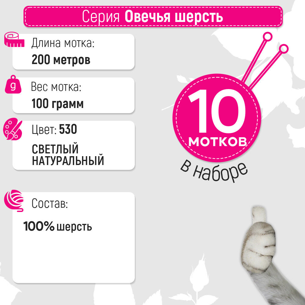 Пряжа Пехорский текстиль "Овечья шерсть", 100%, 200 м, №530, цвет Светлый натуральный, 10 шт по 100 г